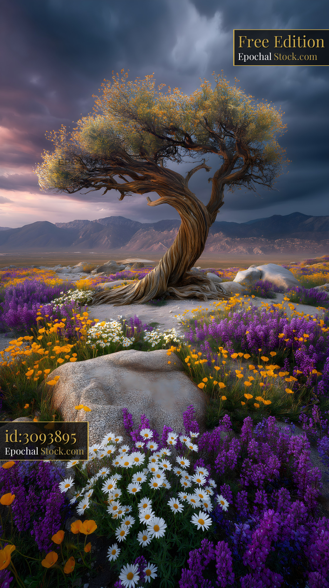 A tree with twisted branches is at the center of a field filled with various flowers. Bright colors and dark clouds create a striking view. Mountains are visible in the background under the sky.