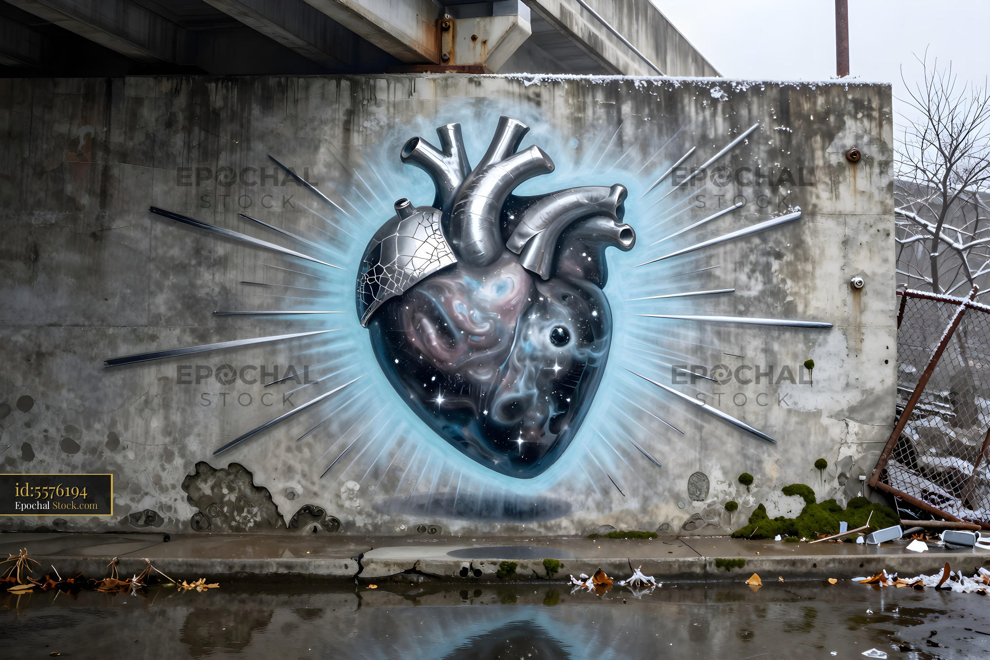 Urban art shows a large heart mural on a concrete wall Premium Stock Image