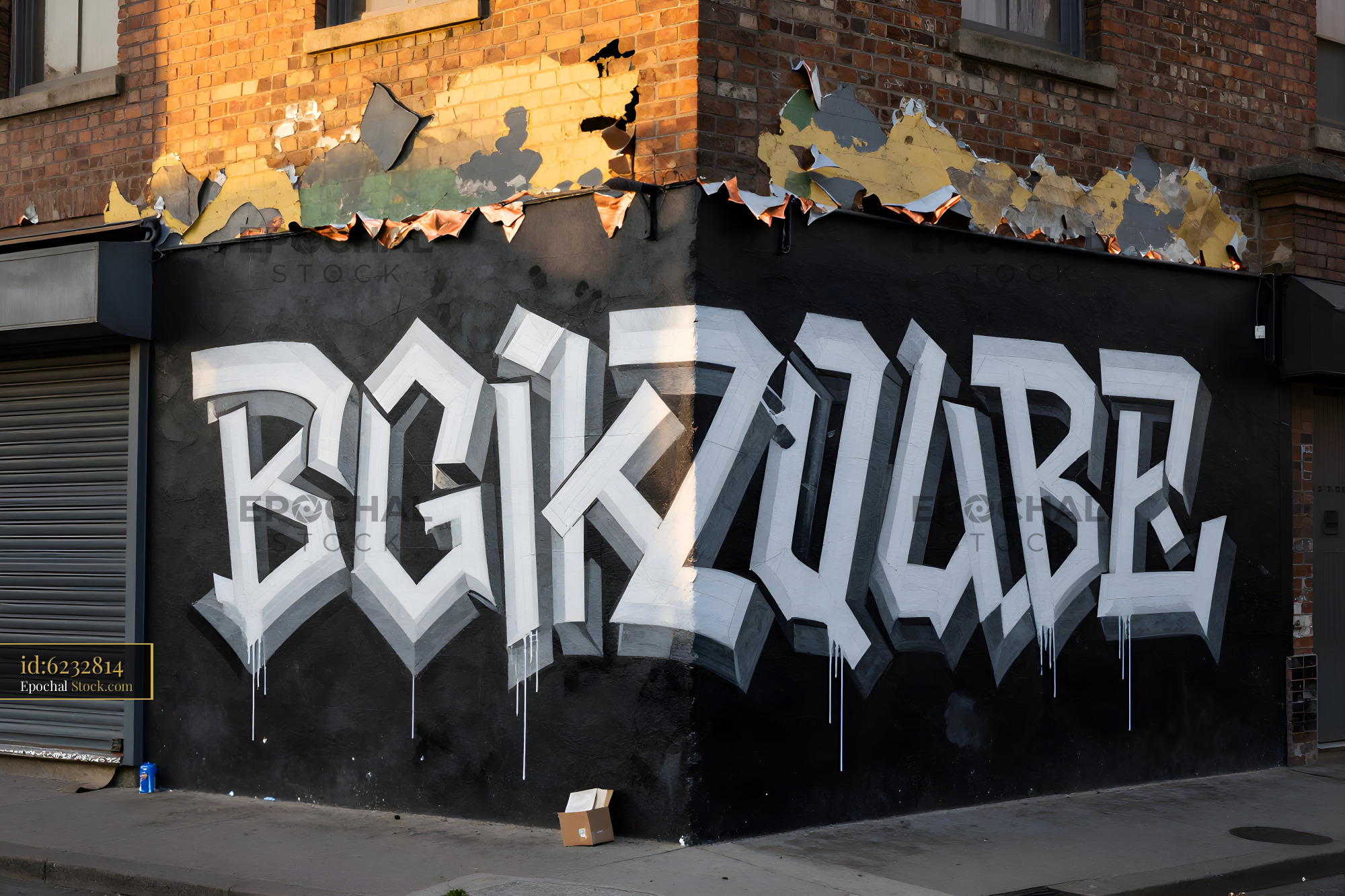 A large black and white mural covers the corner of a brick building. The graffiti displays bold letters. The wall shows wear with peeling paint and debris on the street.