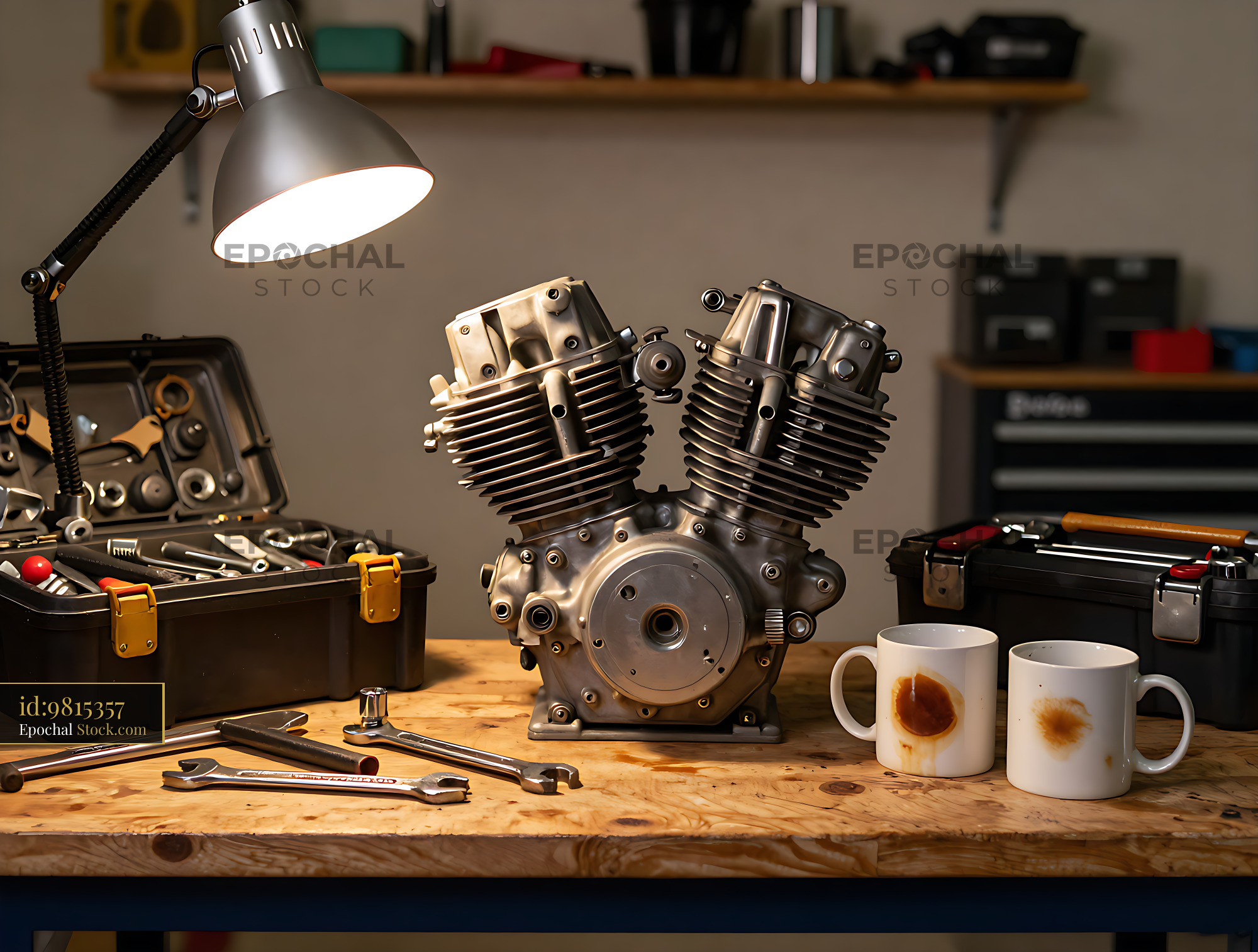 A classic V-twin engine illuminated by a desk lamp on a workbench, surrounded by tools and coffee mugs, evoking themes of mechanical restoration, craftsmanship, and late-night dedication.