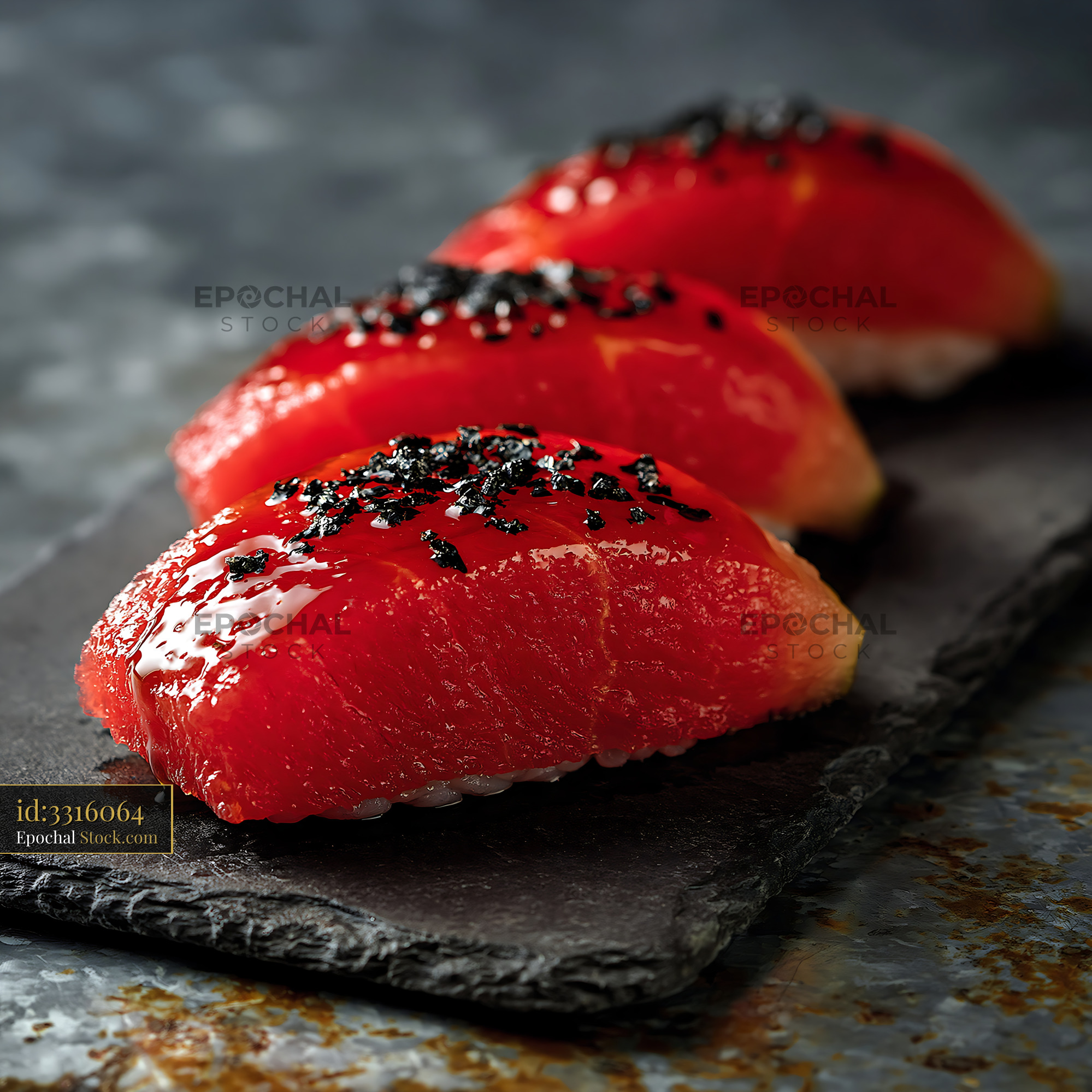 Creative plant-based nigiri made from marinated watermelon to resemble tuna, highlighting sustainable innovation and modern vegan culinary arts on a rustic slate board.