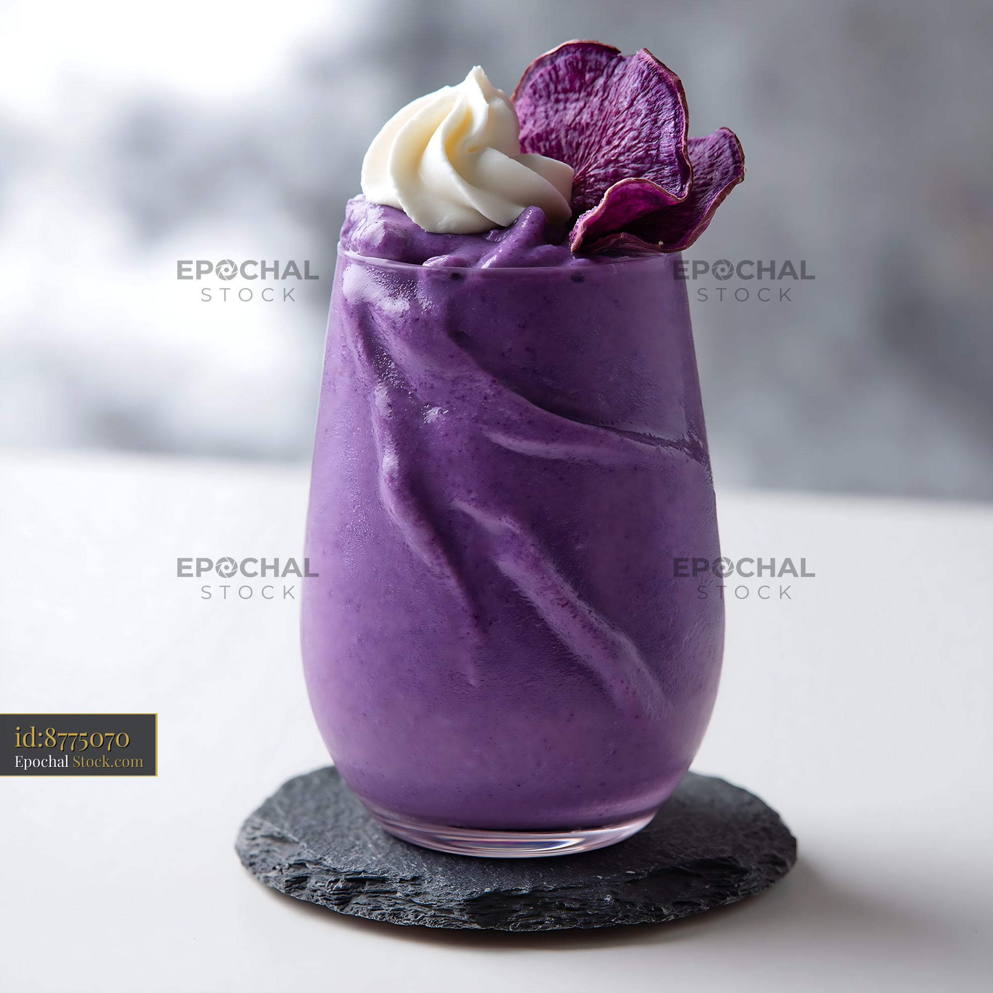A creamy purple sweet potato smoothie served in a glass on a slate coaster, capturing the essence of Okinawan superfoods and a healthy, gourmet lifestyle.