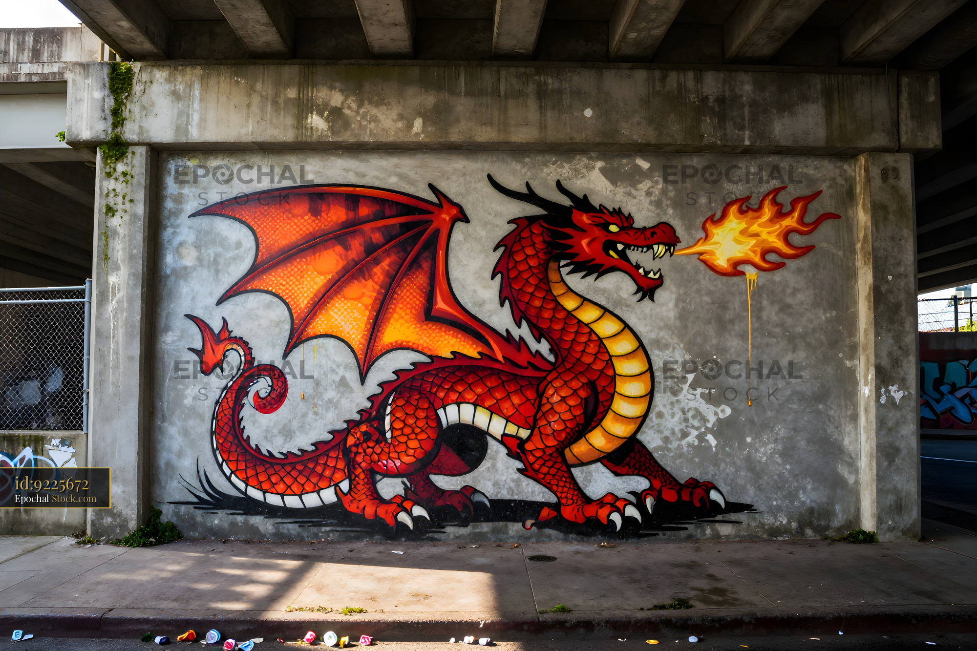 A red dragon mural is painted on a concrete wall under an overpass. The dragon is breathing fire and appears dynamic. The surrounding area shows graffiti and urban details.