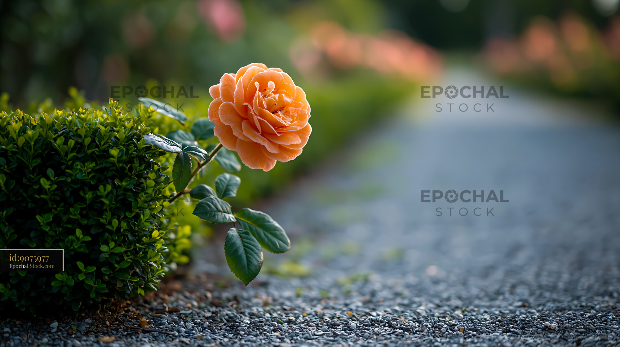 Vibrant orange rose blooming in a formal garden by a gravel path