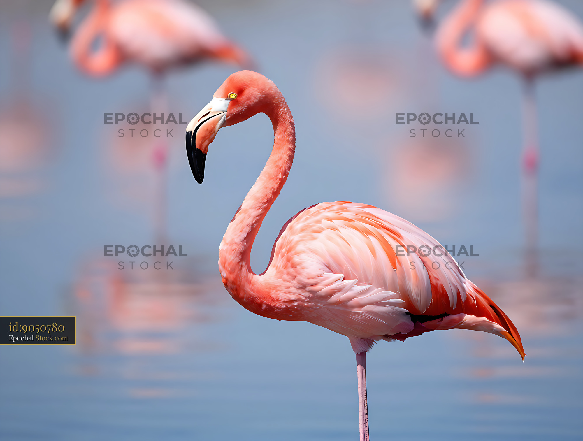 A vibrant pink flamingo stands gracefully in calm blue water, surrounded by a blurred flock, evoking a sense of tropical elegance, serenity, and natural beauty in its habitat.