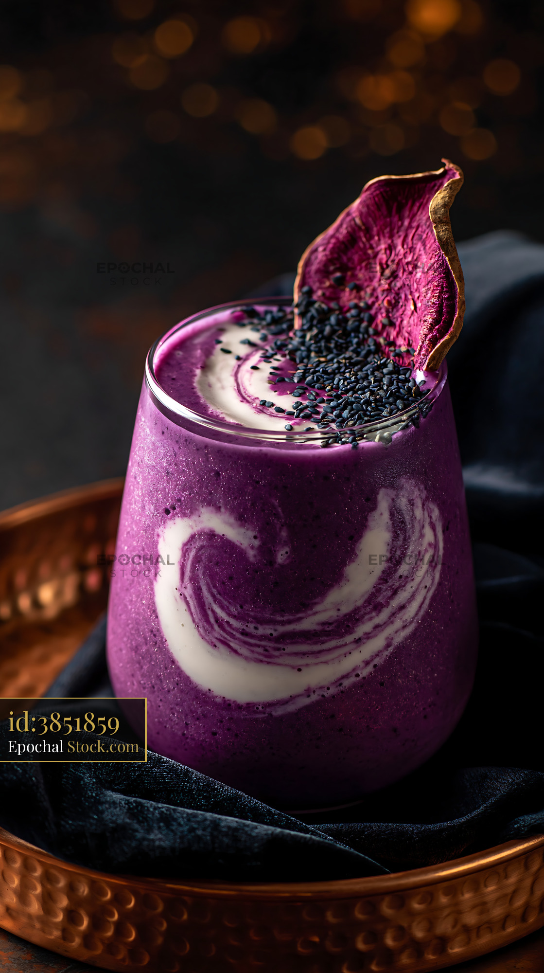Vibrant purple beni imo smoothie with yogurt swirl and sesame seeds