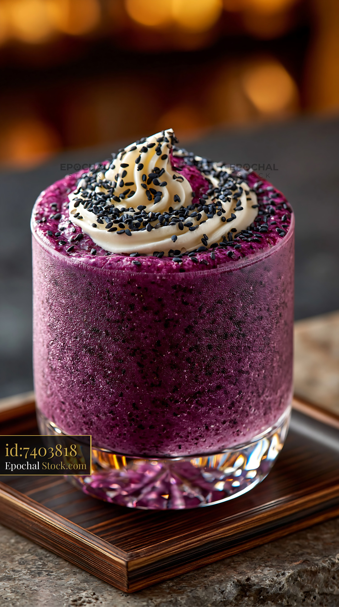 A refreshing purple sweet potato smoothie served in a glass with a swirl of whipped cream and black sesame seeds, representing healthy indulgence and modern superfood trends.