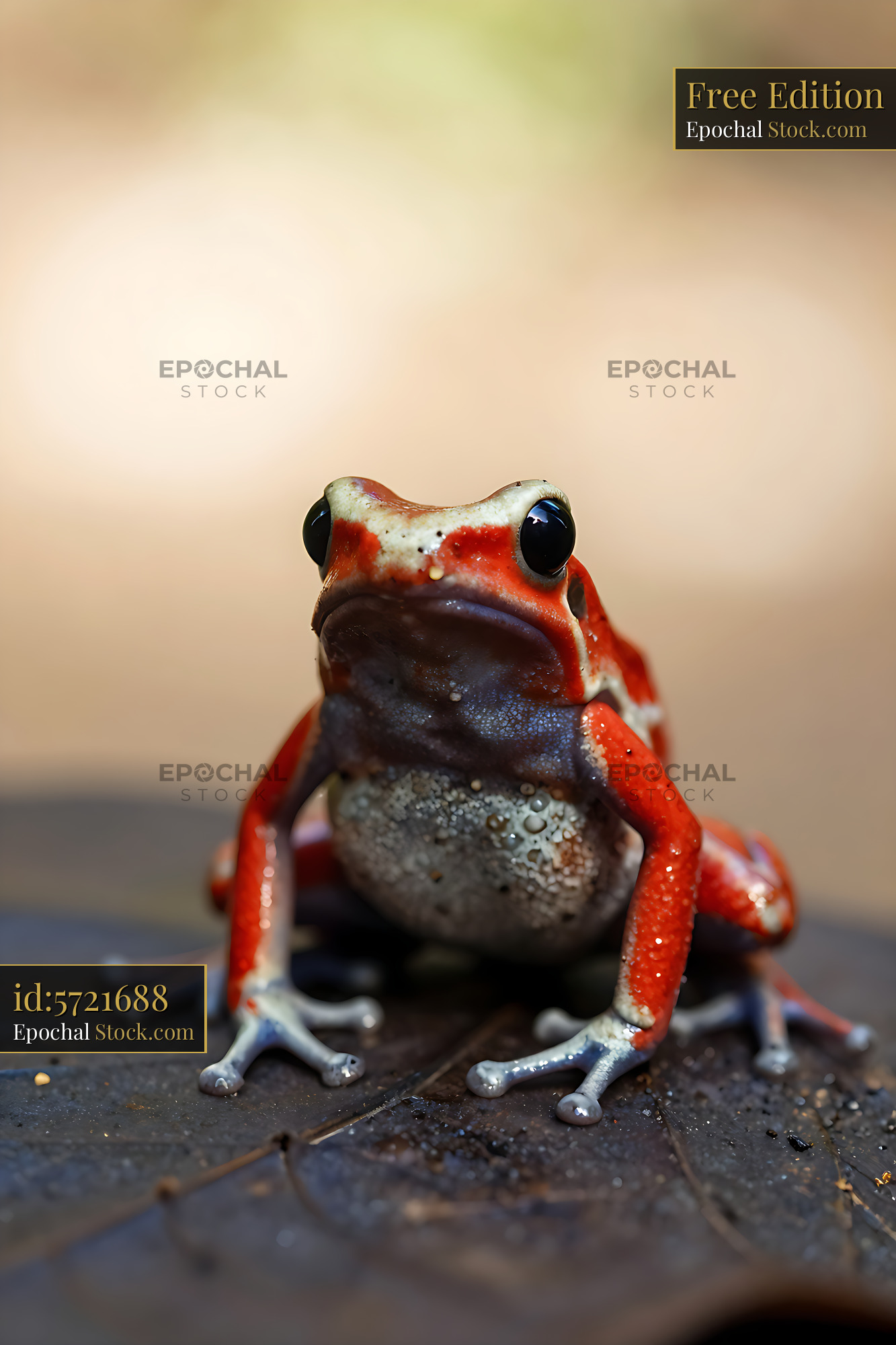 A colorful strawberry poison dart frog rests on a damp forest floor leaf, showcasing its brilliant warning colors and delicate features in a tropical rainforest setting.