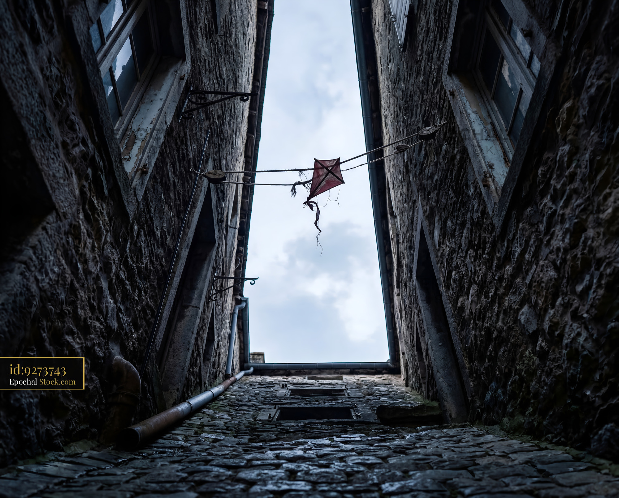 Looking up from the ground in a narrow alley, tall stone walls rise on either side. A kite hangs above, and the sky is cloudy. The scene captures a moment of stillness in a historic area.