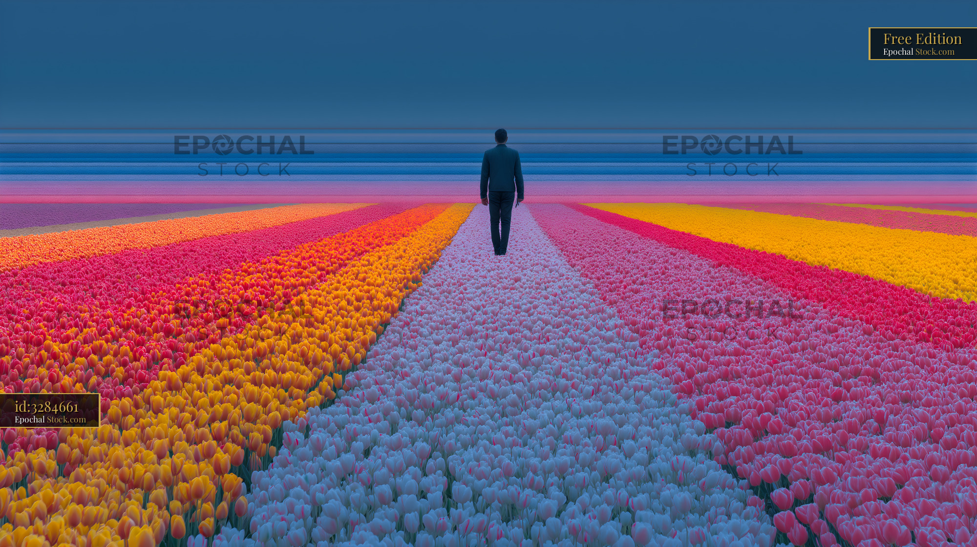 A person walks alone in a vast field filled with rows of flowers at sunset. The scene shows bright colors of tulips stretching into the horizon under a darkening sky.