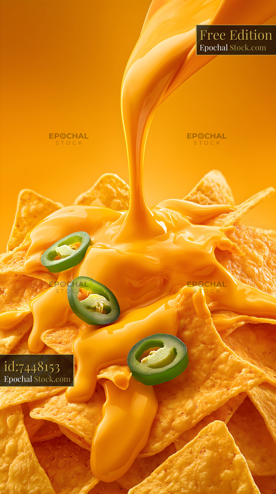 Warm cheese sauce pours over crispy tortilla chips with jalapenos Free Premium Stock Photo