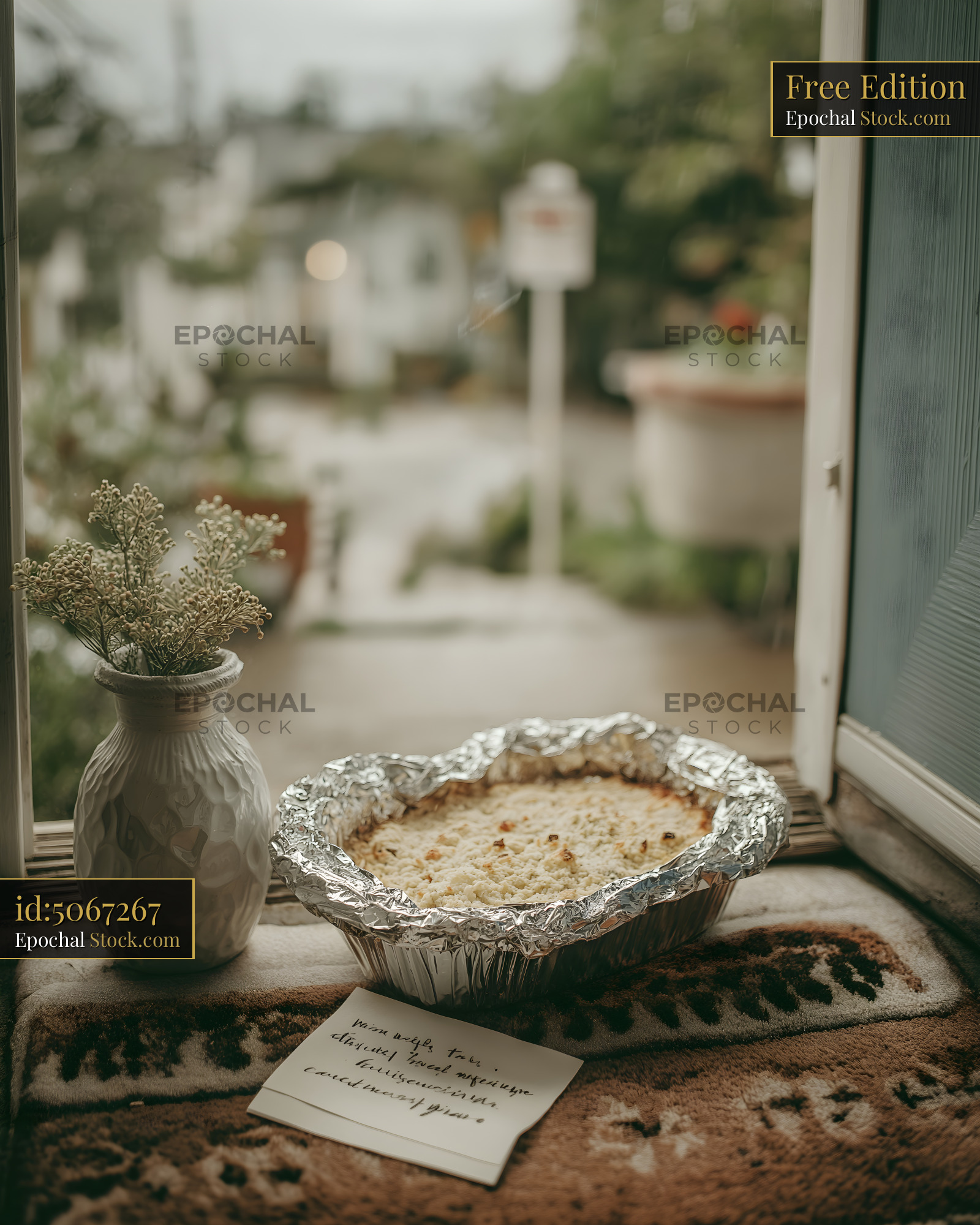A dish covered in foil sits on a window sill. A small vase with flowers stands next to it. A note lies beside the dish. Outside, the weather looks cloudy and calm.