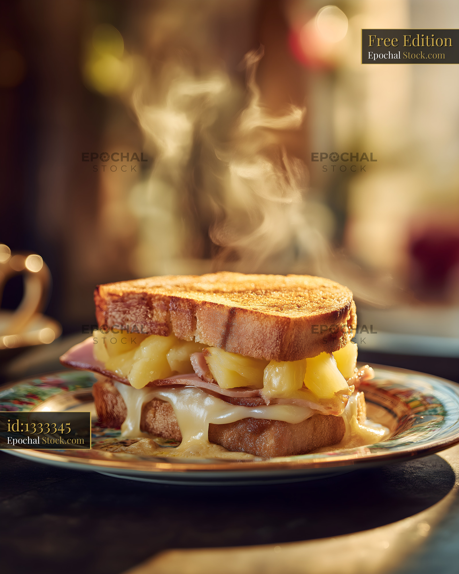 A sandwich sits on a plate with cheese and pineapple. Steam rises from the food. Warm light fills the space. This scene shows a cozy kitchen setting.
