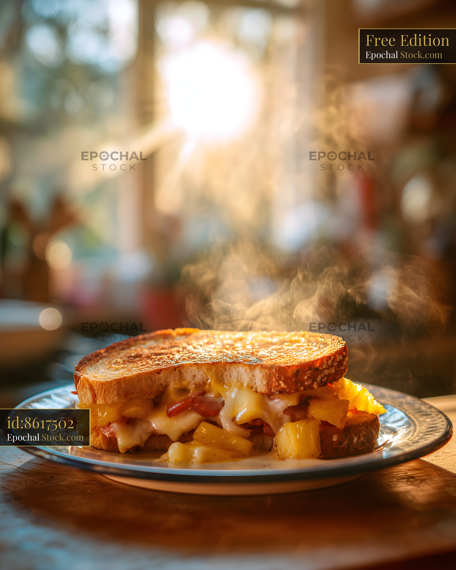 A sandwich sits on a plate with melted cheese and chunks of pineapple. Steam rises from the warm sandwich in a sunlit kitchen during the evening.