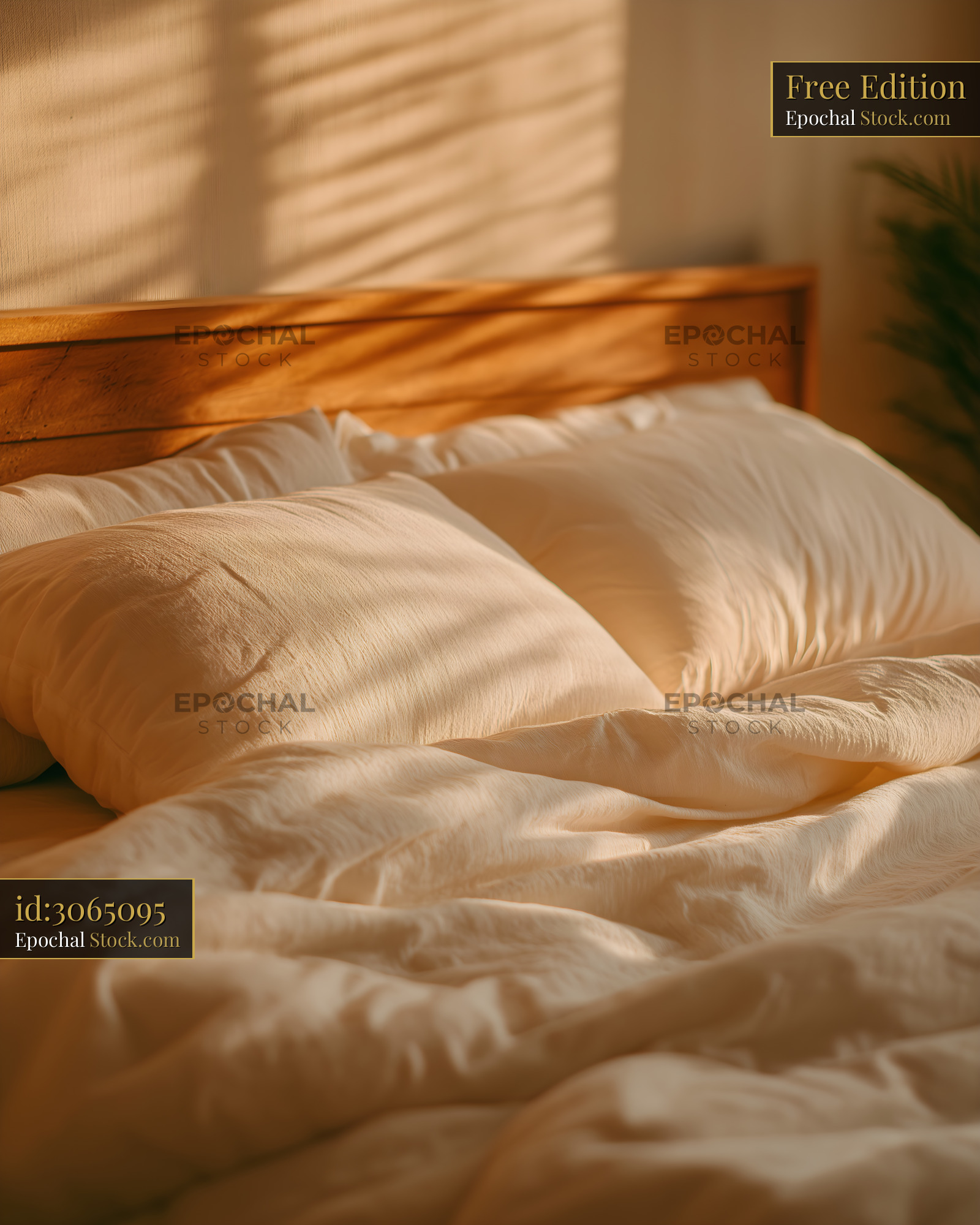 Warm sunlight on cozy bed with pillows and soft sheets Free Premium Stock Image