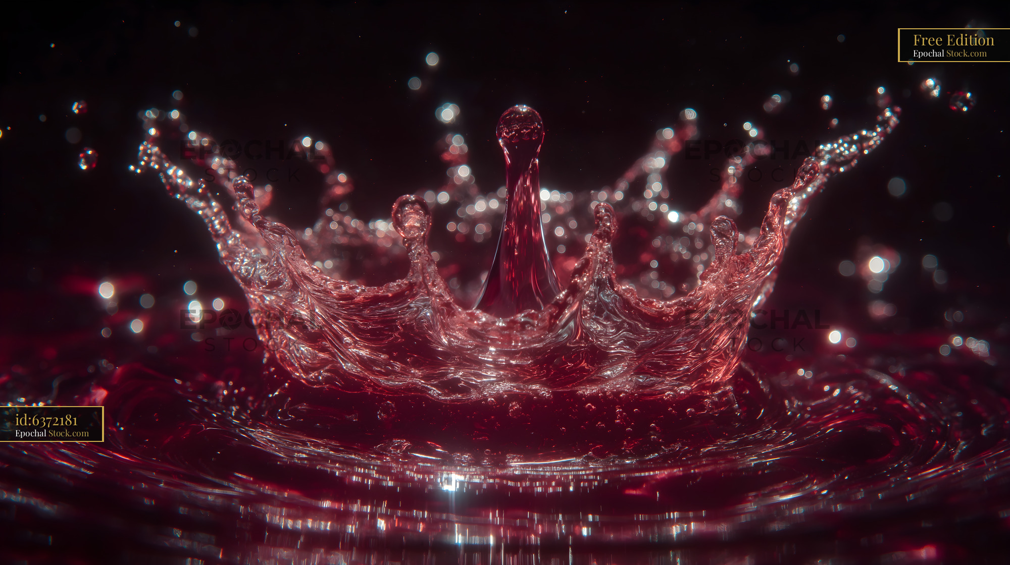 Liquid drops fall into red water, creating a crown shape as they spread. The splash sends out droplets in a circular pattern. Light reflects off the water surface, adding shine.