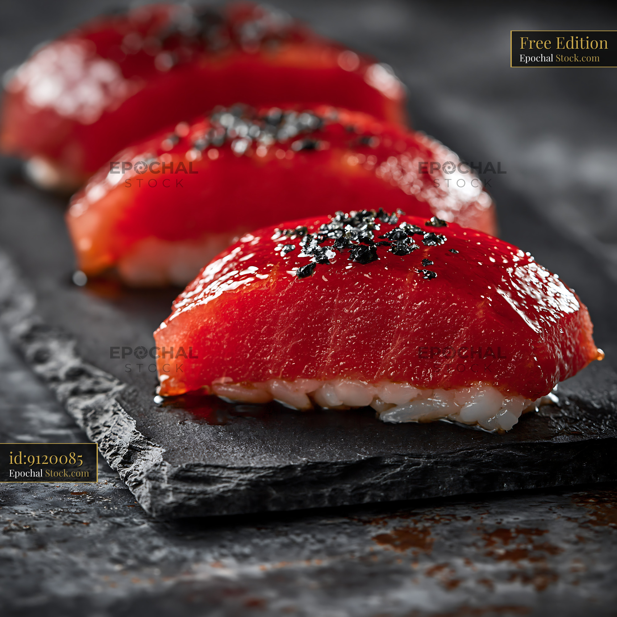 Three pieces of plant-based watermelon tuna sushi on a dark slate. This creative vegan alternative evokes a sense of modern culinary innovation and sustainable healthy eating.