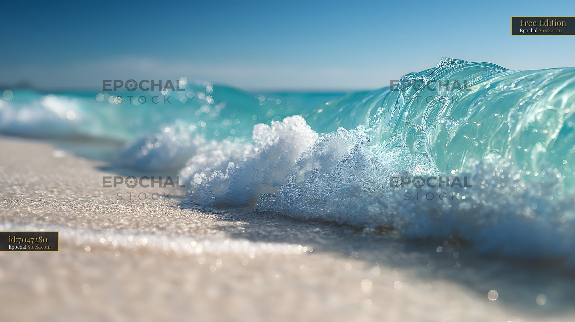 Ocean waves roll onto a sandy beach. The water is clear and blue. Small foam forms where the waves break. The sun shines brightly above, and the scene shows a still moment of nature.