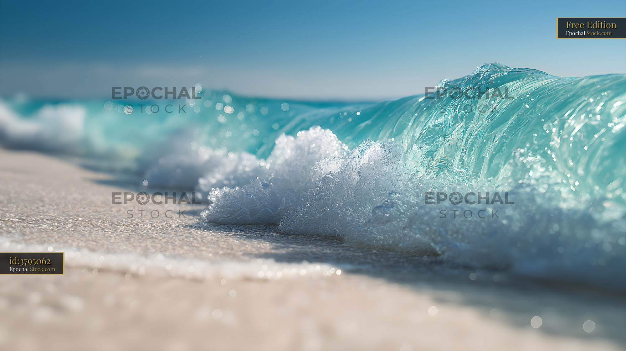 Waves roll onto a sandy beach under a clear sky. Foam forms as water splashes against the shore. The sun shines brightly, creating a vibrant scene of sea and sand.