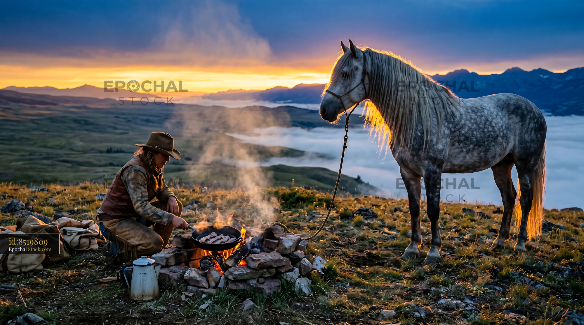 This cinematic western landscape features a cowgirl cooking over a campfire with her dapple grey horse. Perfect for rustic home decor, adventure-themed quilts, or unique wallpaper.