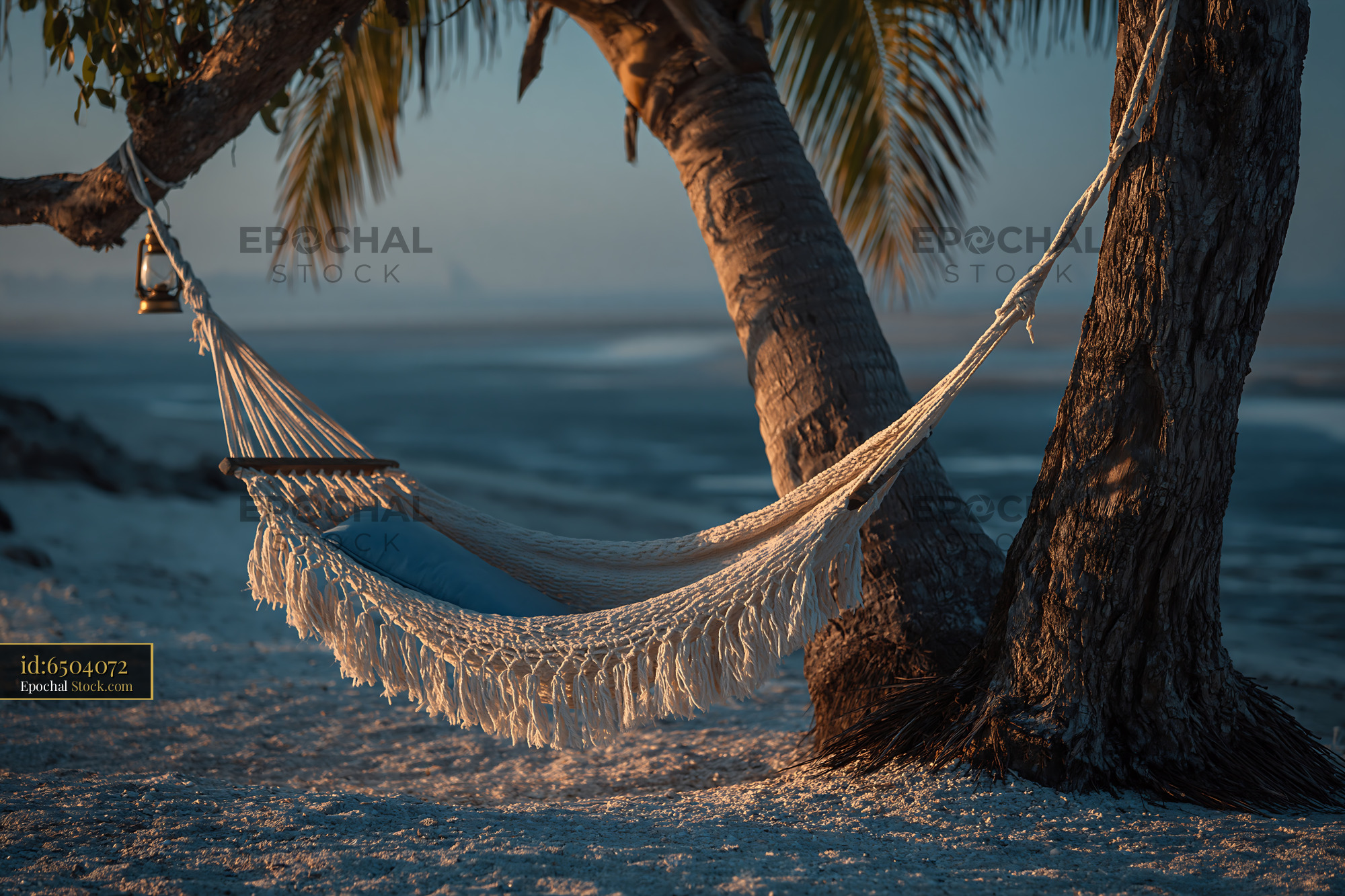An empty white hammock with fringes hangs between palm trees on a serene tropical beach, capturing the essence of relaxation and a peaceful escape during the golden hour.