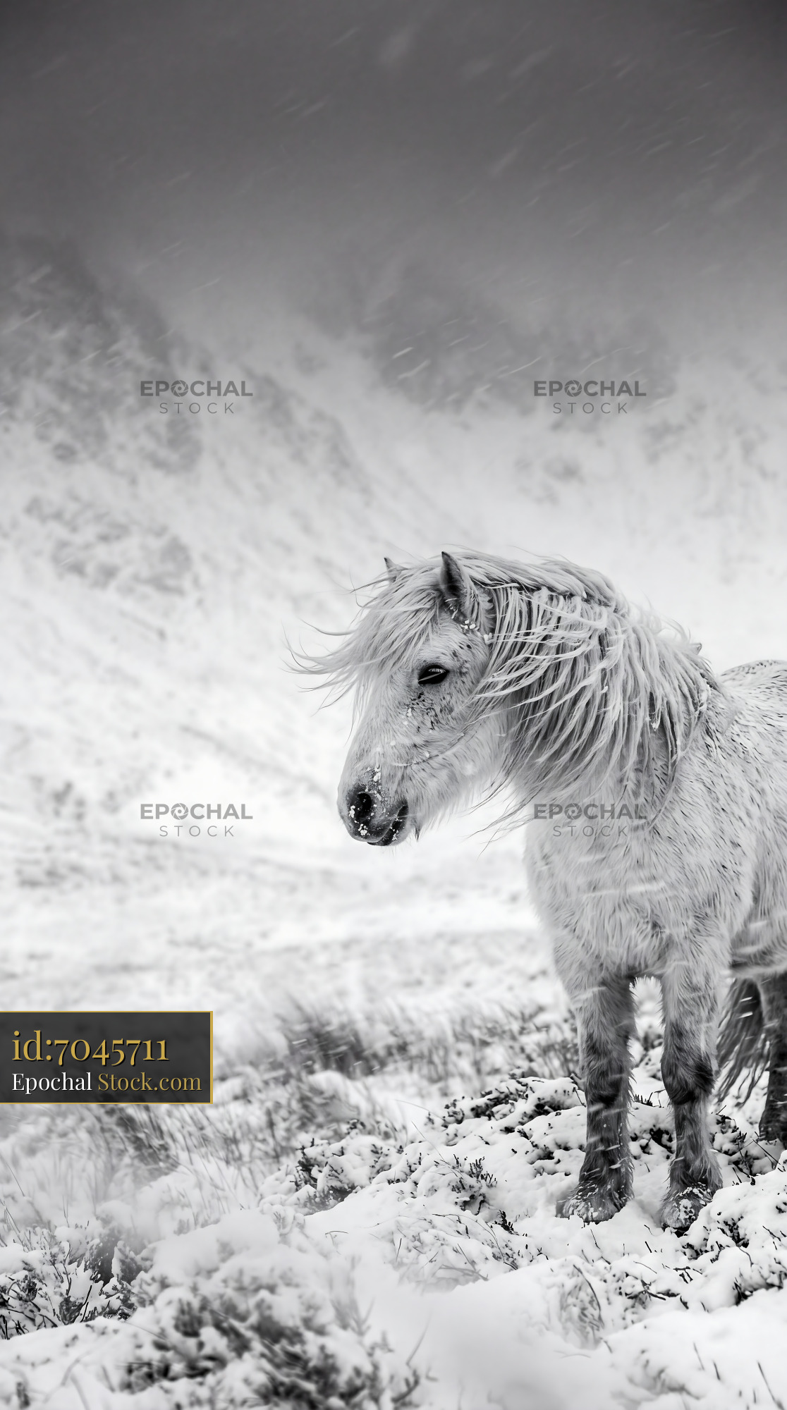 White Horse Mane Blowing in Winter Blizzard
