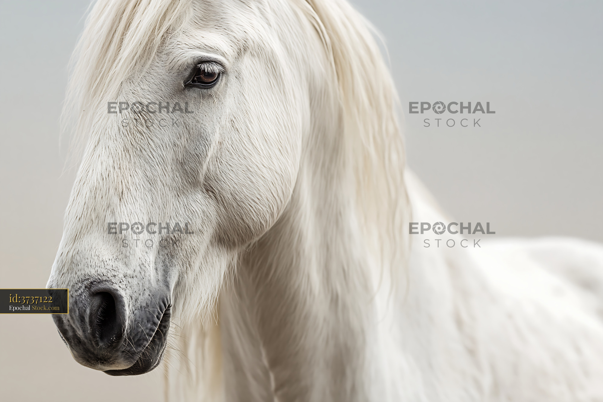 A majestic white horse with silky, flowing mane is captured in an elegant side profile against a neutral gray background. The intimate close-up portrait emphasizes the horse's serene expression and refined beauty, evoking themes of grace, nobility, and peaceful contemplation.