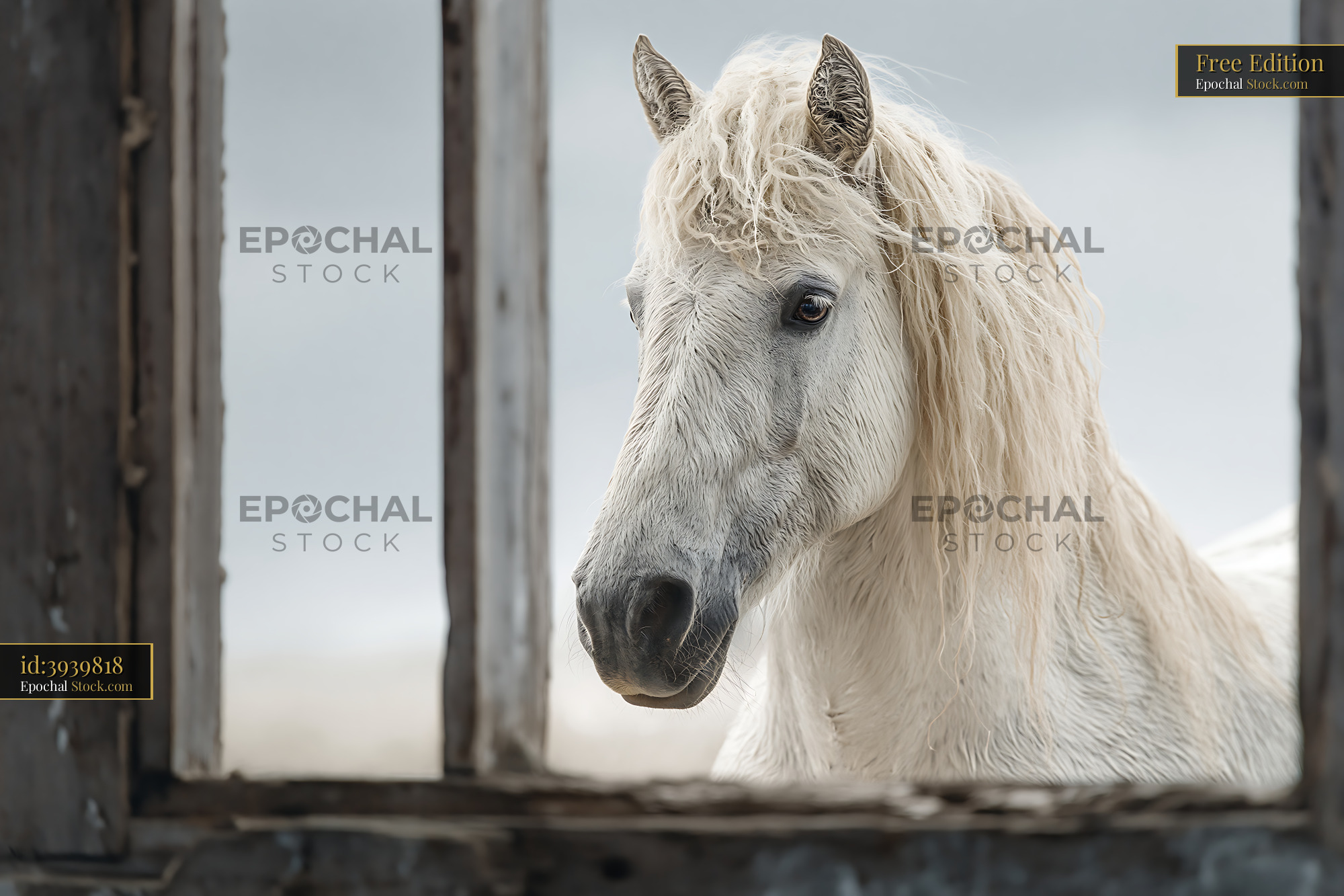 White horse with long mane looking through a weathered window frame