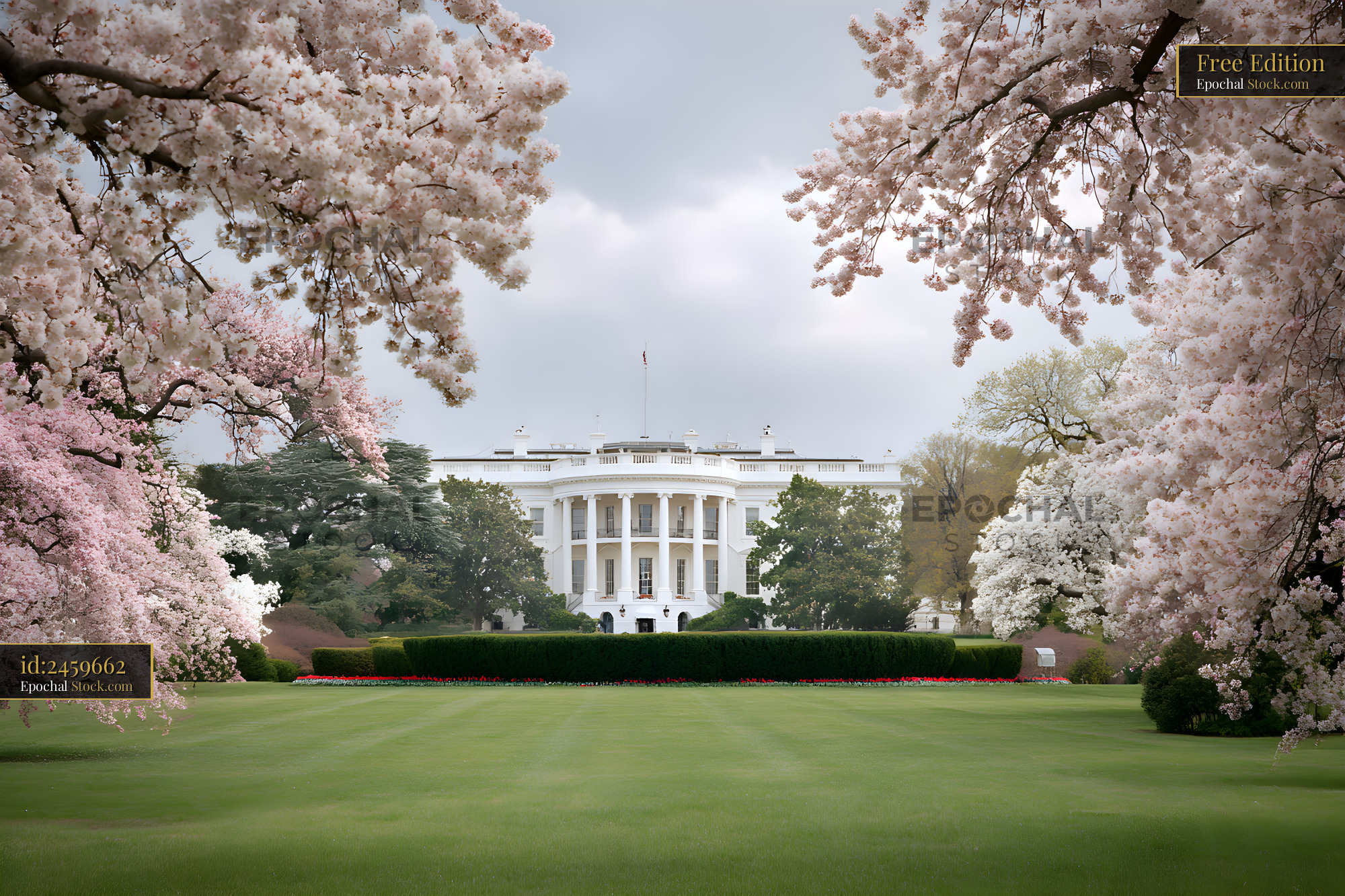 Cherry blossom trees surround the White House in Washington, D.C. In spring, the flowers bloom, adding color to the green lawn. Visitors can enjoy the view of this historic building.