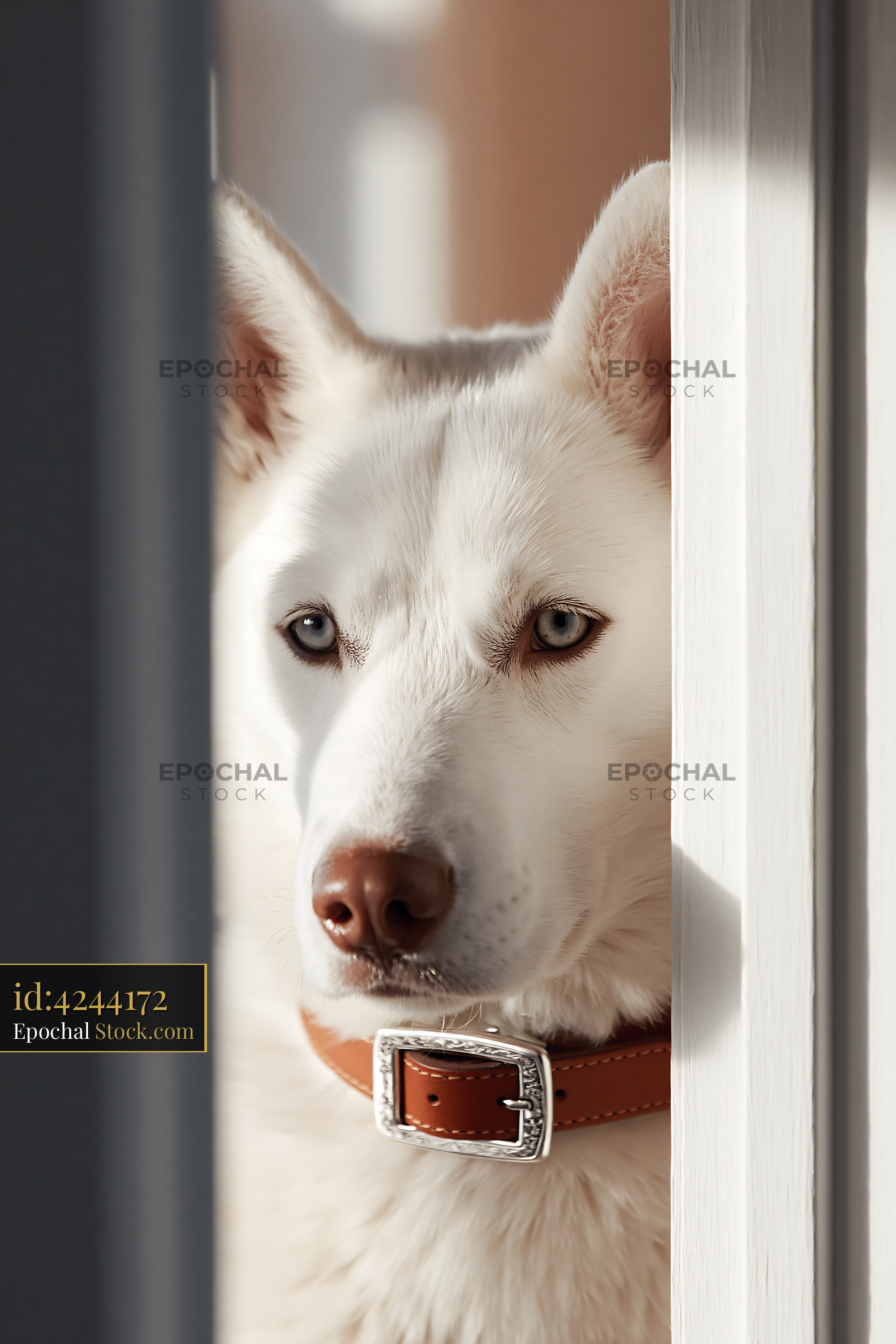 A close-up of a white Siberian Husky with bright eyes peering through a door frame, capturing a moment of domestic curiosity, patience, and loyal companionship.