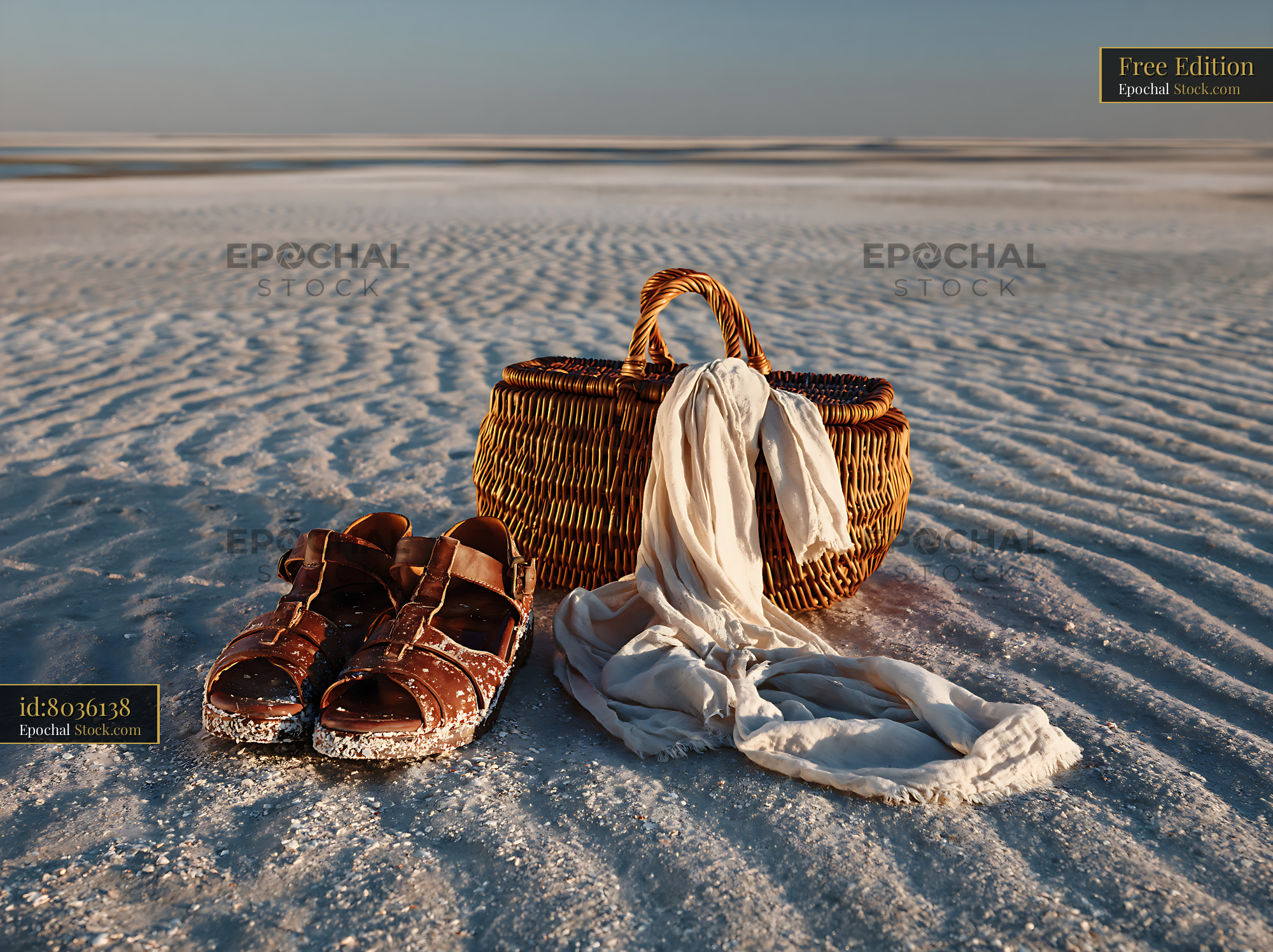 A wicker basket, leather sandals, and a linen scarf rest on the rippled surface of a vast salt flat, capturing the essence of a peaceful desert adventure and solitude during golden hour.
