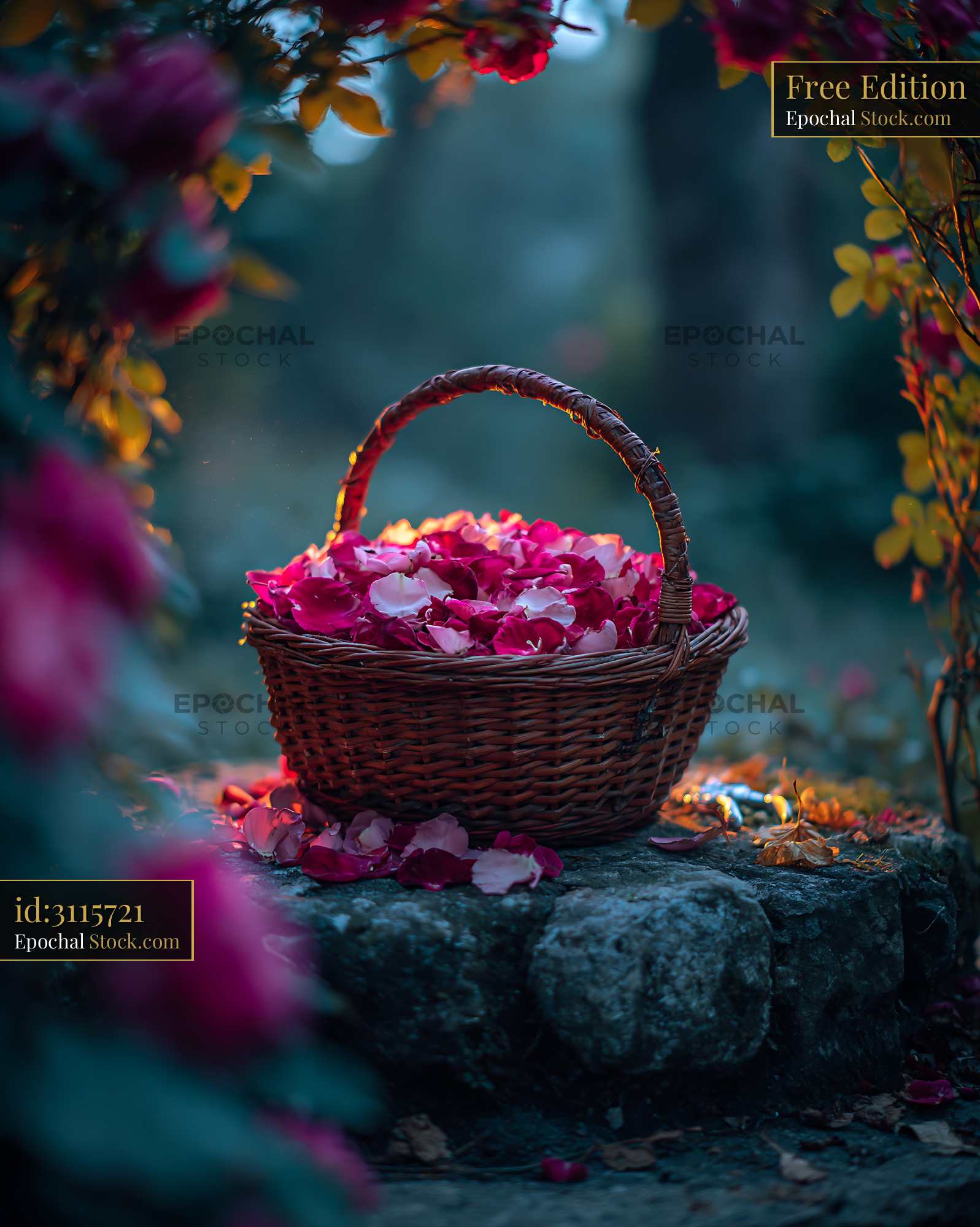 A rustic wicker basket overflowing with fresh pink rose petals sits on a stone pedestal in a magical garden, glowing with warm light to evoke romance, magic, and whimsical beauty.