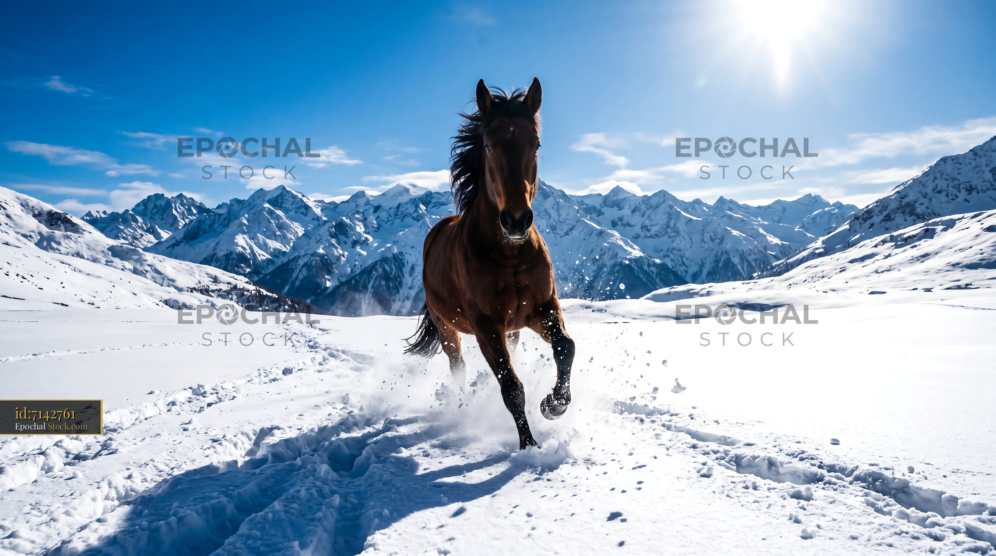 Wild Brown Stallion Galloping Through Winter Snow