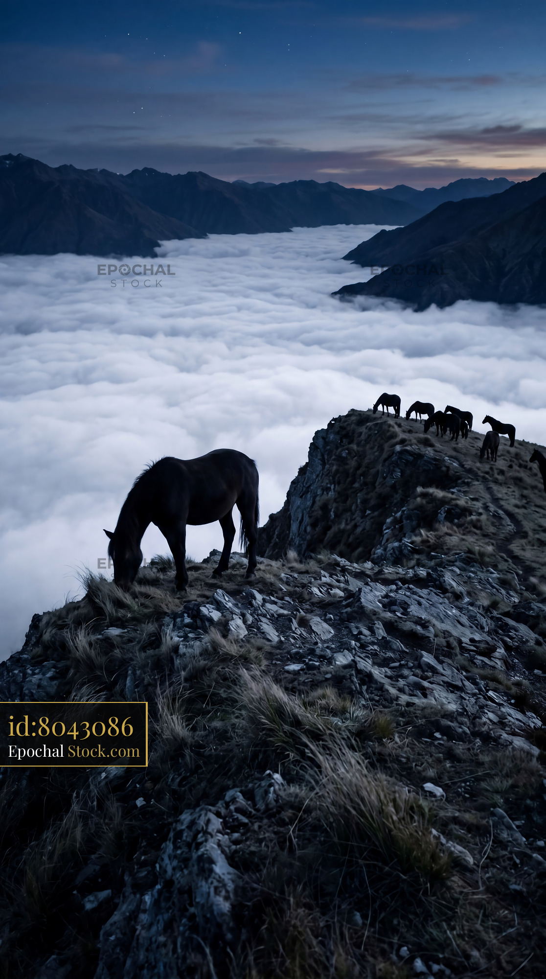 This serene landscape pattern features wild horses grazing above a sea of clouds. Perfect for statement wallpaper, moody quilting projects, or unique home decor accents.
