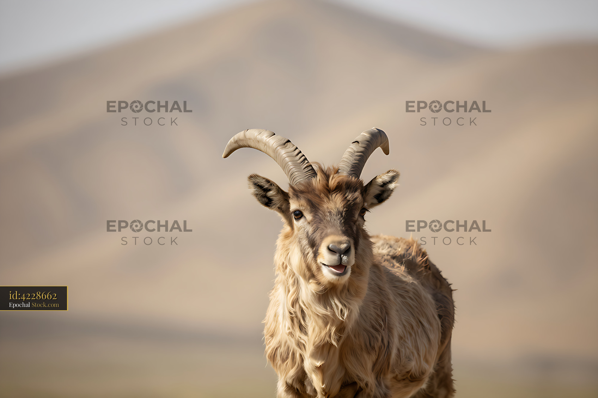 A majestic wild goat stands against a blurred mountain backdrop, capturing a moment of curiosity and the raw beauty of animals in their natural, arid habitat.