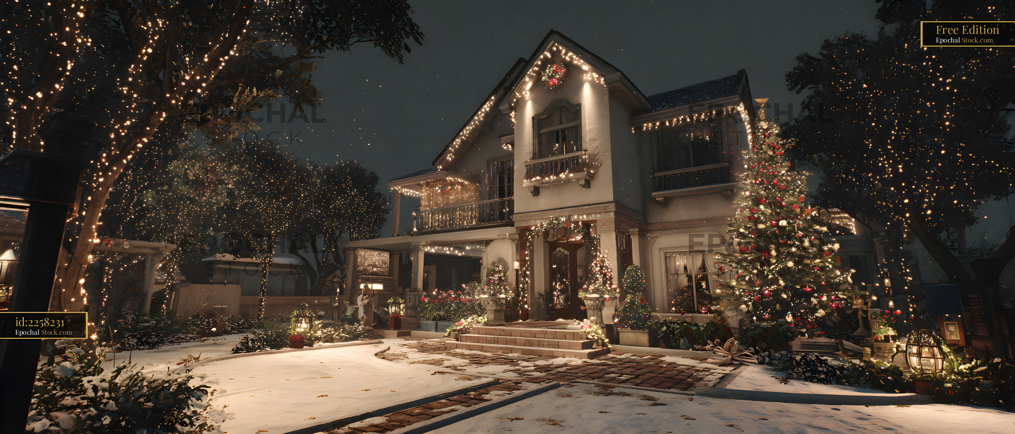 Winter holiday lights shine on a decorated house at night Free Premium Stock Photo