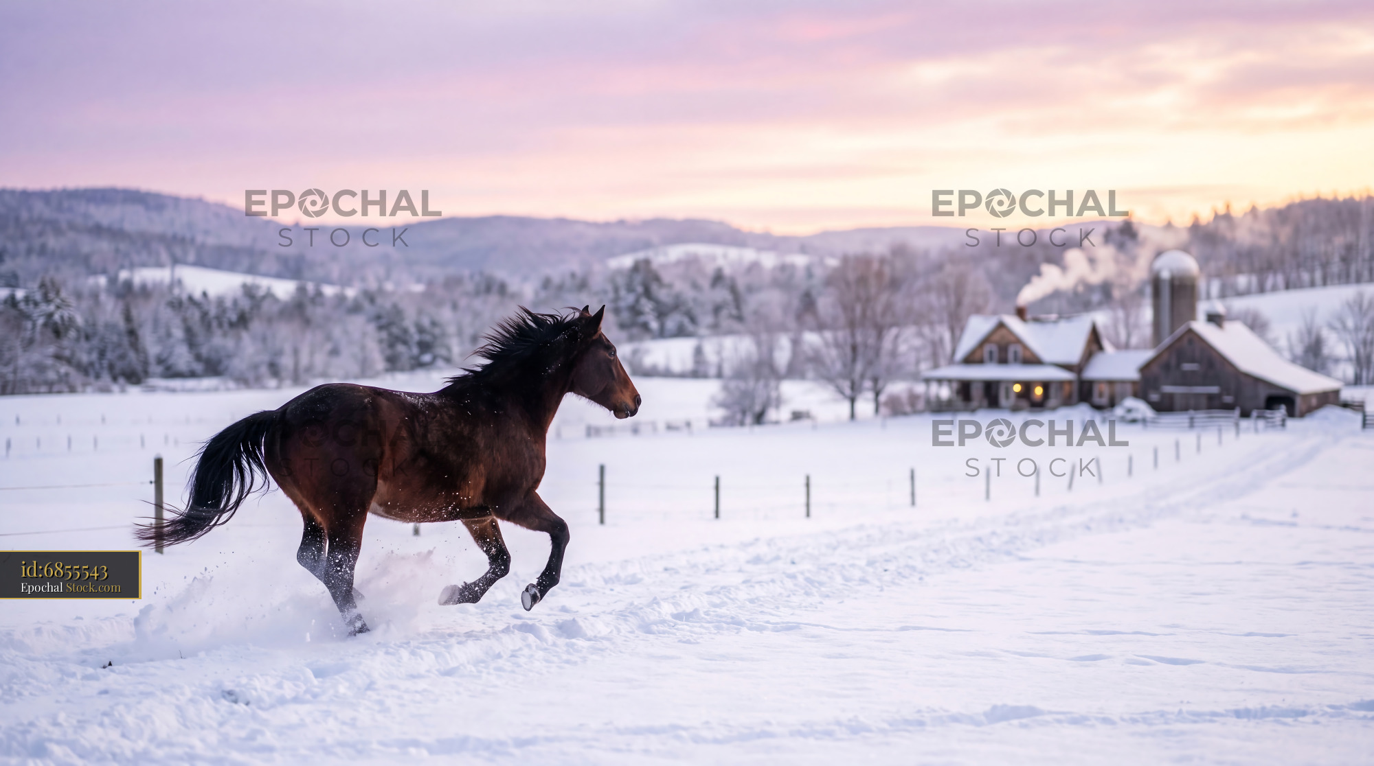 A serene winter scene featuring a horse running through snow toward a cozy farmhouse. Perfect for seasonal quilting, rustic nursery wallpaper, and holiday gift wrap.