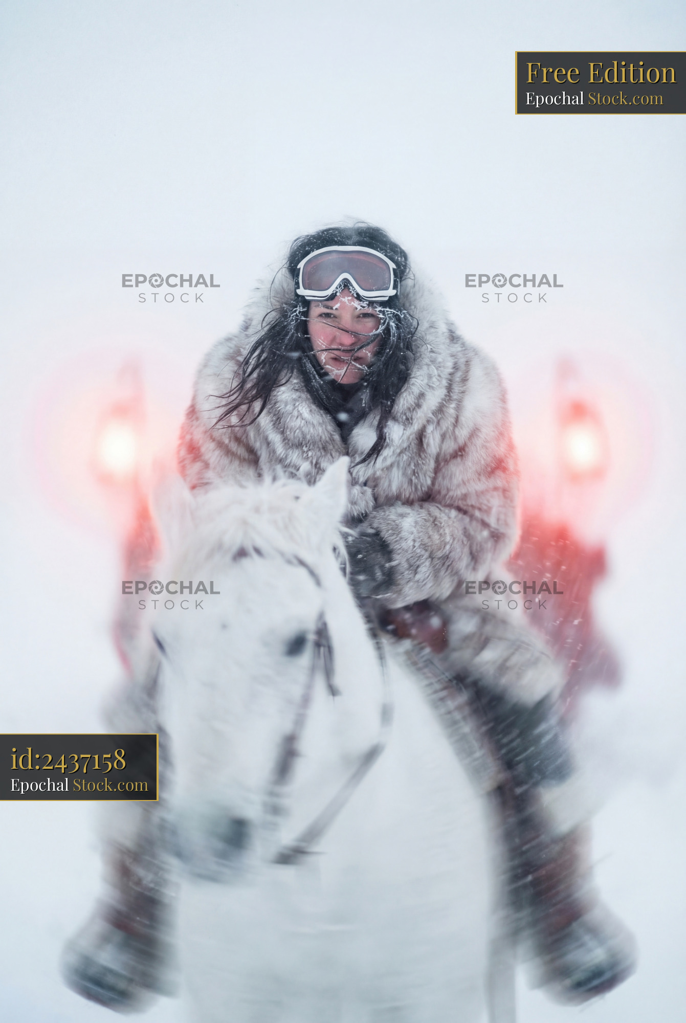 A person rides a white horse through heavy snow. The scene shows a snowy backdrop with strong wind and visibility challenges. The rider is dressed warmly and focused ahead.