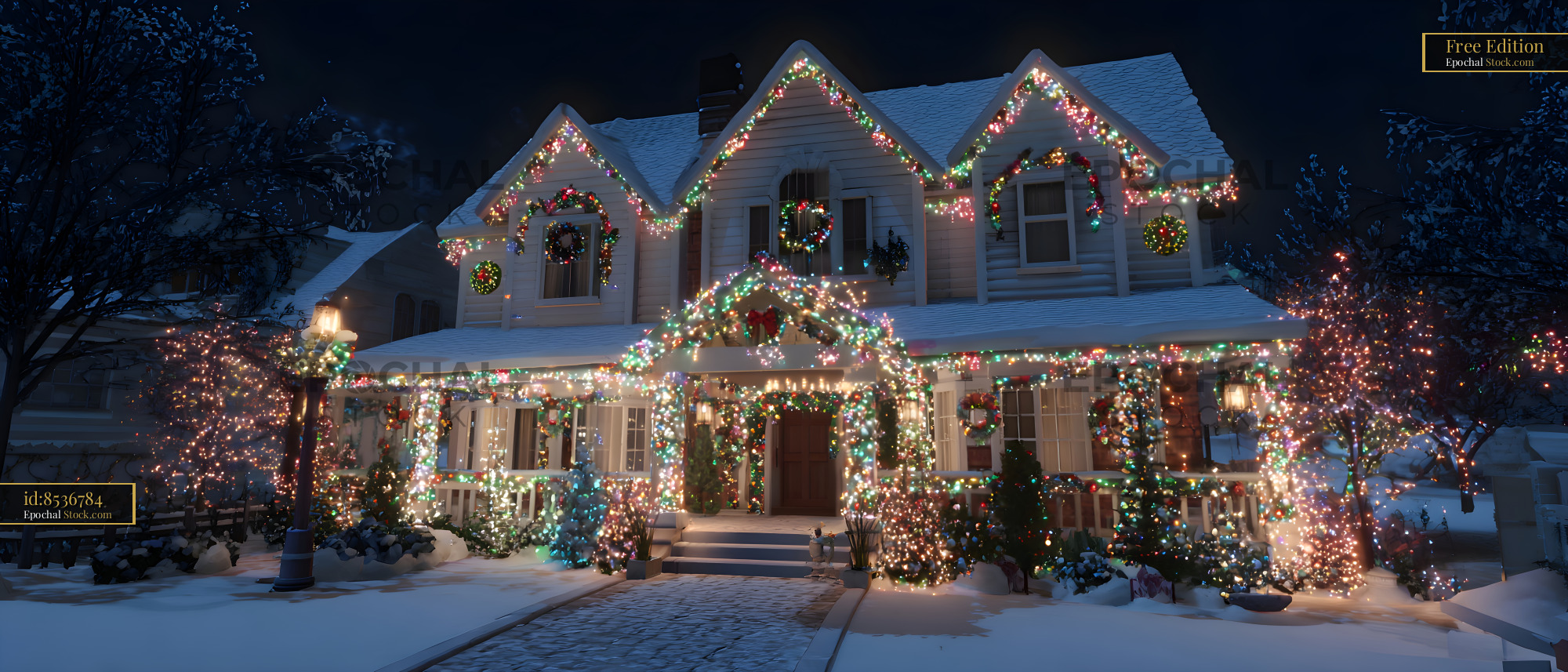 Winter scene shows a house decorated with lights Free Premium Stock Image