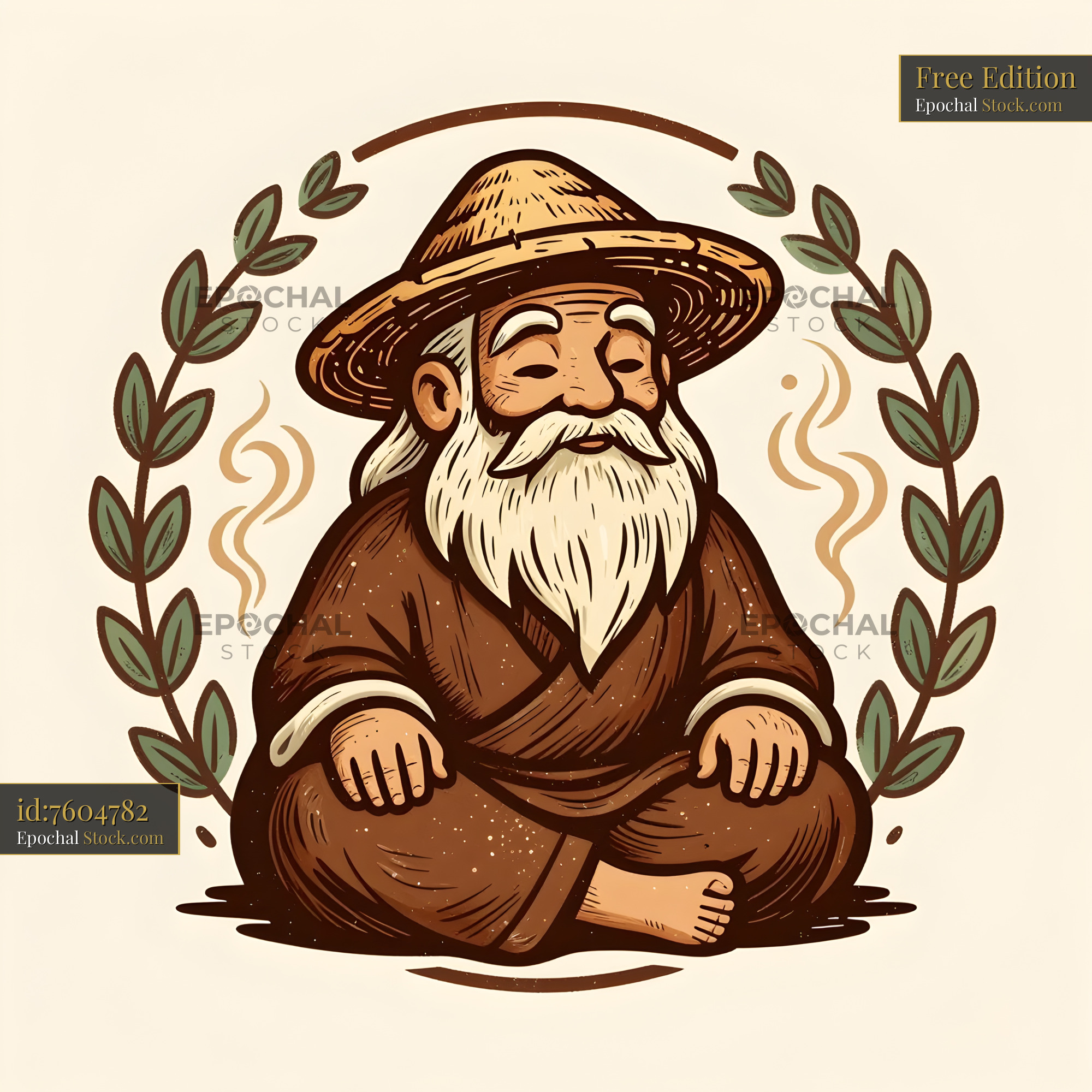 A wise man sits in a meditative pose wearing a straw hat and a simple robe. He has a long beard and a peaceful demeanor. Leaf decorations surround him, adding to the setting.