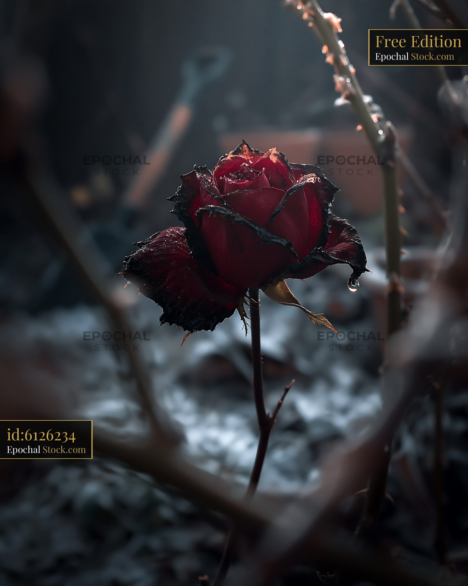 A single withered red rose with charred edges stands in a dark garden, a water droplet hanging from a petal, evoking themes of lost love, fading beauty, and resilience.