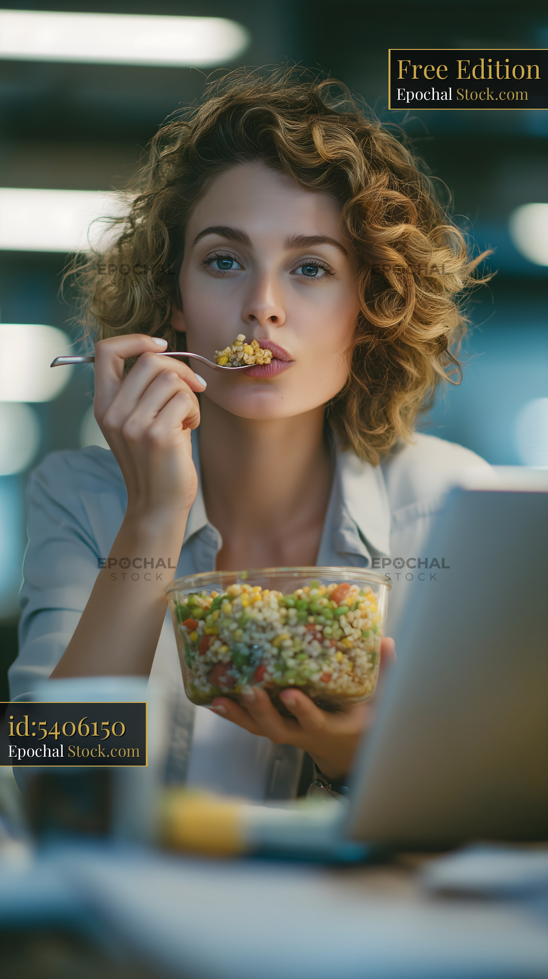 A woman sits at her desk in the evening, eating a bowl of salad while looking focused on her laptop. She has curly hair and a calm expression as she enjoys her meal.