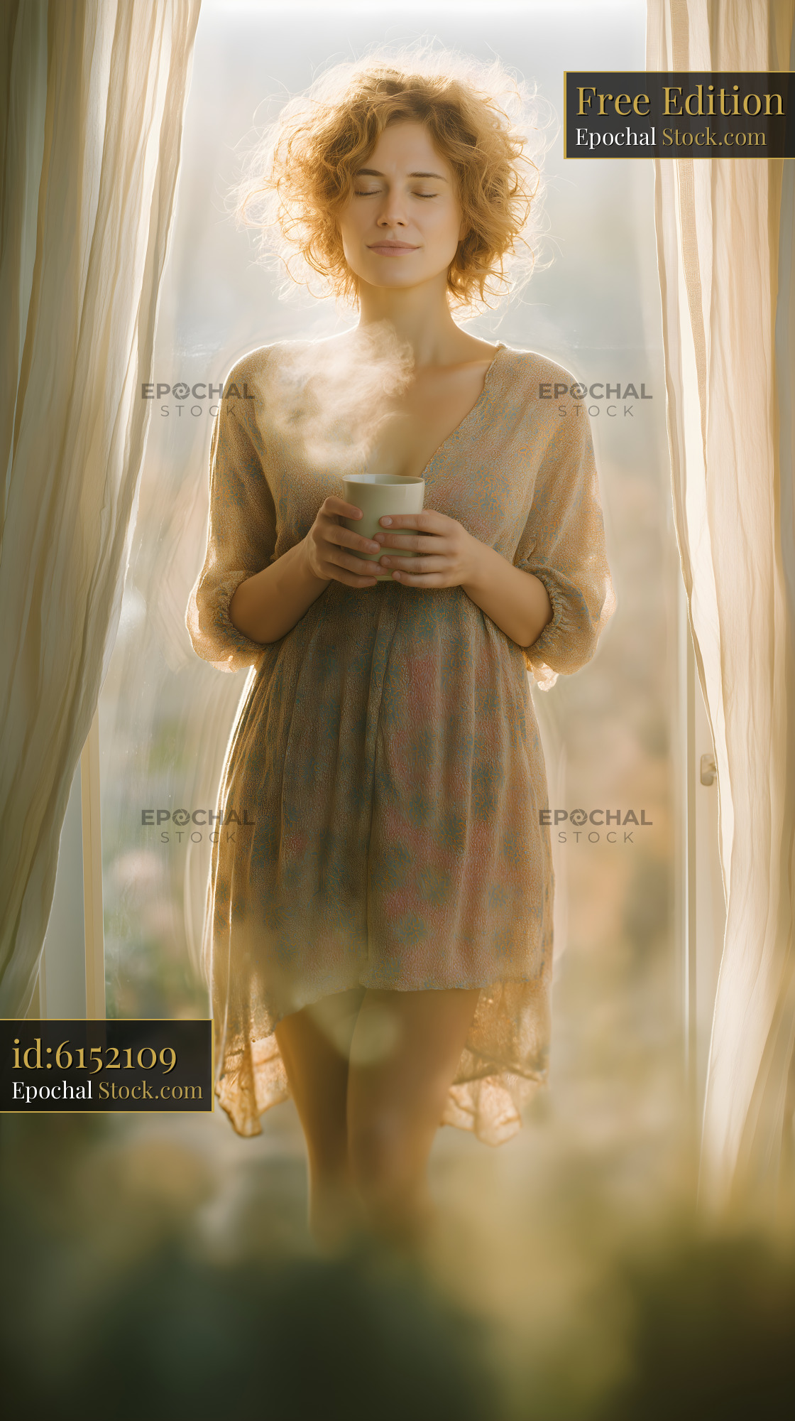 A woman stands by a window, holding a warm cup while steam rises from it. Sunlight shines through the curtains. She appears to be in a relaxed moment, enjoying her drink.