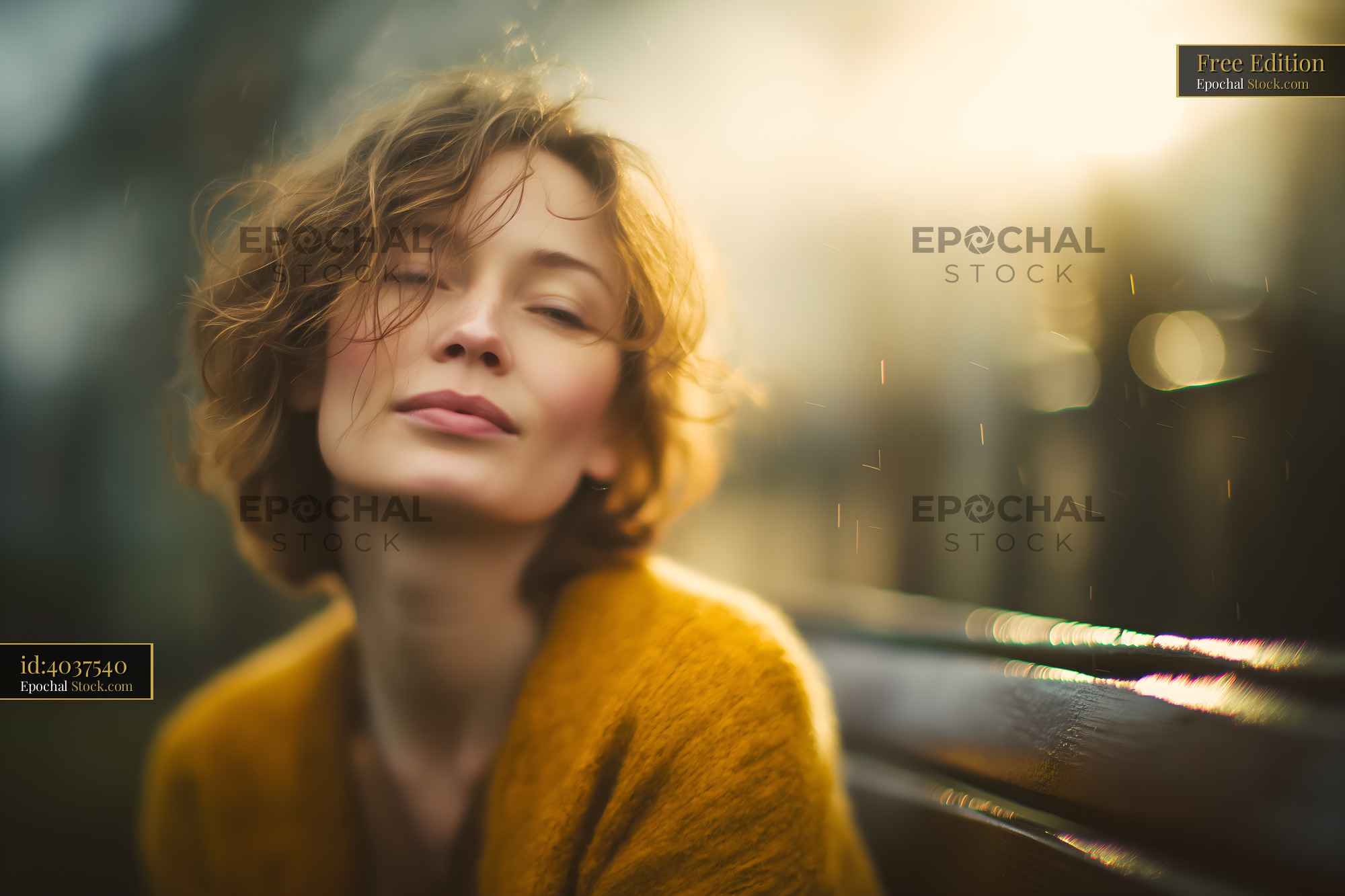A woman sits on a bench outdoors, appearing relaxed and thoughtful. Sunlight filters through light rain, creating a warm atmosphere. Trees and distant buildings are visible in the background.