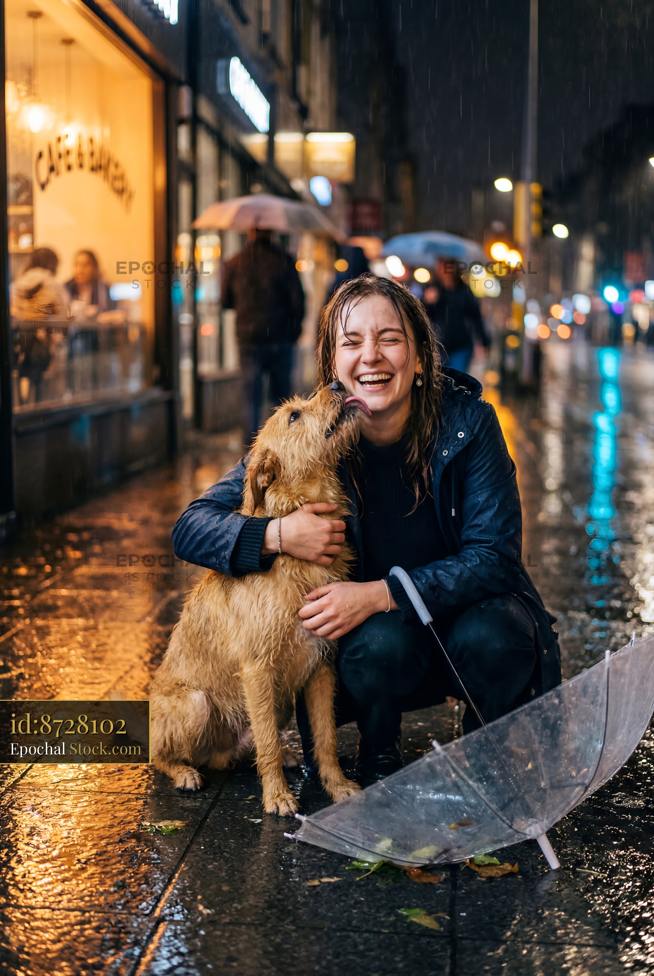 Woman enjoys time with dog in rain at city street Premium Stock Image