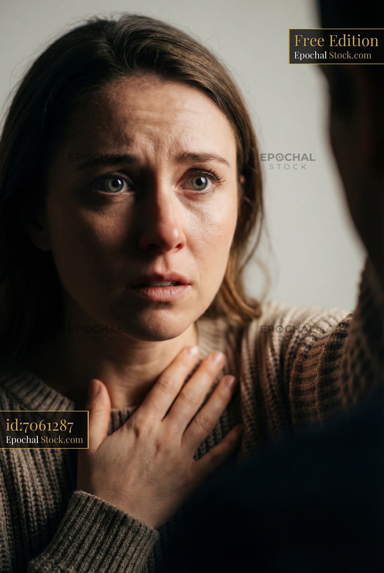 A woman is engaged in a serious discussion. She looks worried as she touches her throat and gazes intently at the man speaking to her. The setting is indoor with soft lighting.