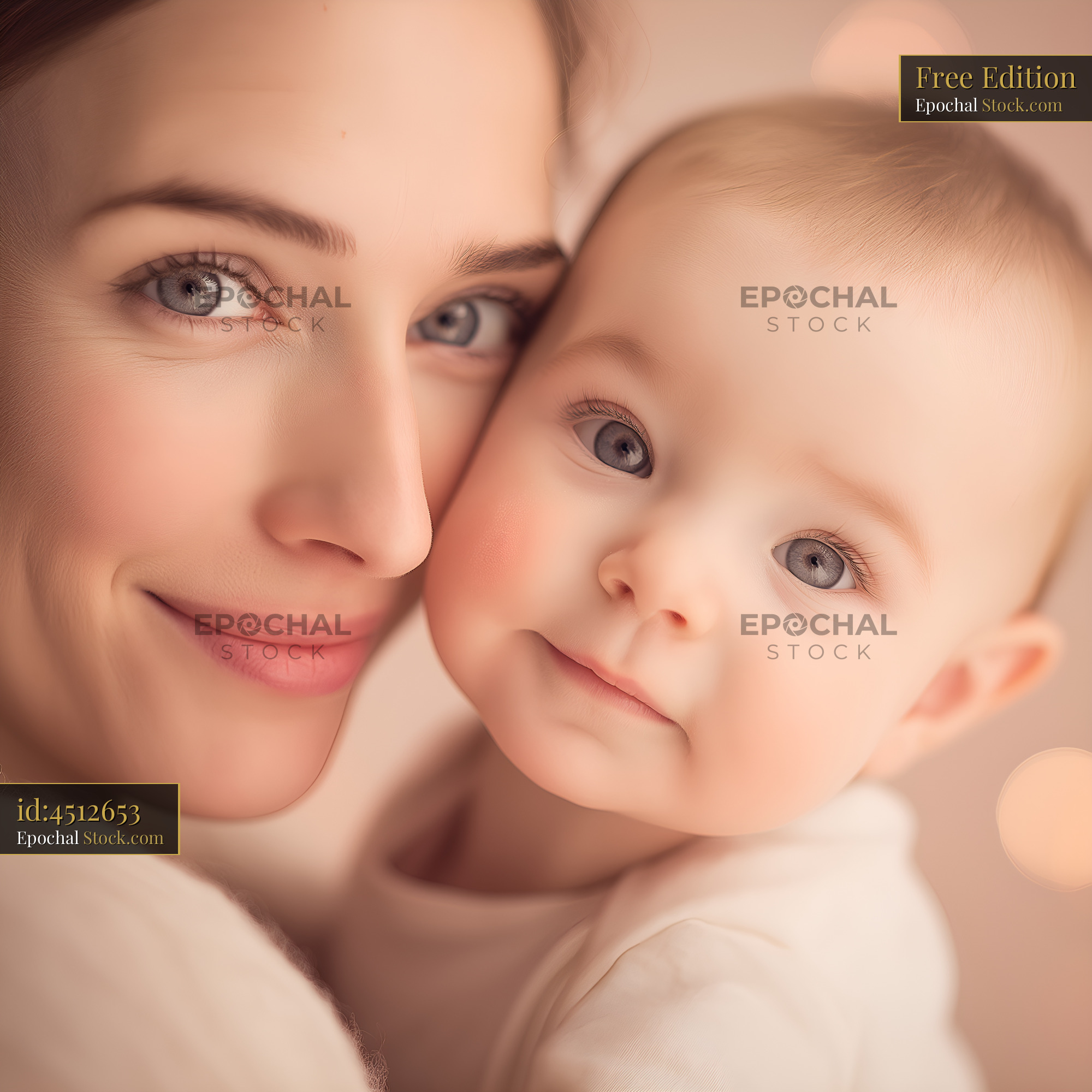 A mother smiles while holding her baby close. They share a bonding moment with soft lighting in the background. The baby looks into the camera with curiosity and joy.