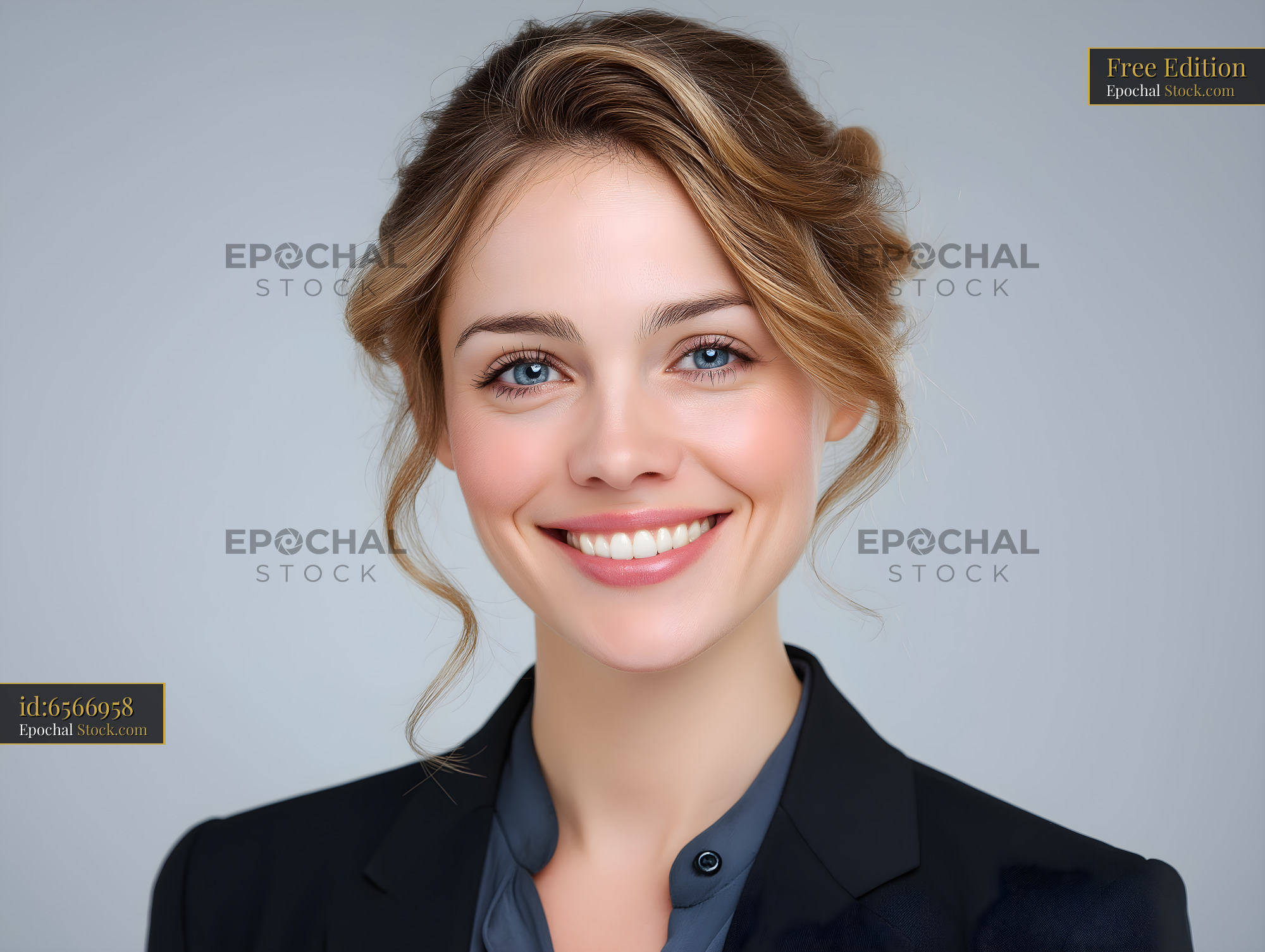 A woman stands in a studio wearing a suit. She smiles and looks directly at the camera. The background is light gray, and her hair is styled softly.