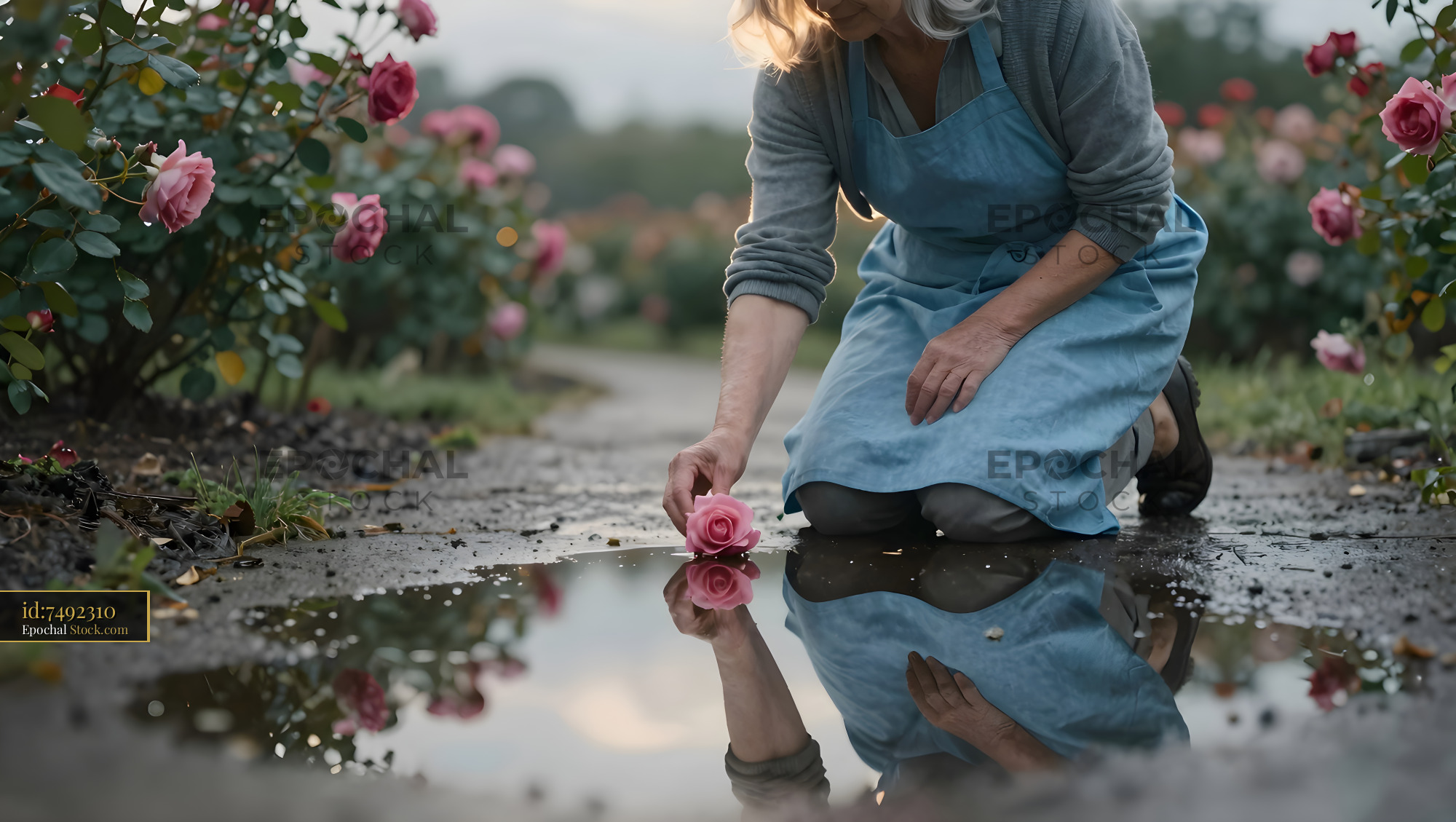 A woman kneels beside a puddle in a flower garden. She reaches for a pink rose that has fallen into the water. Flowers surround her as the sun sets in the background.