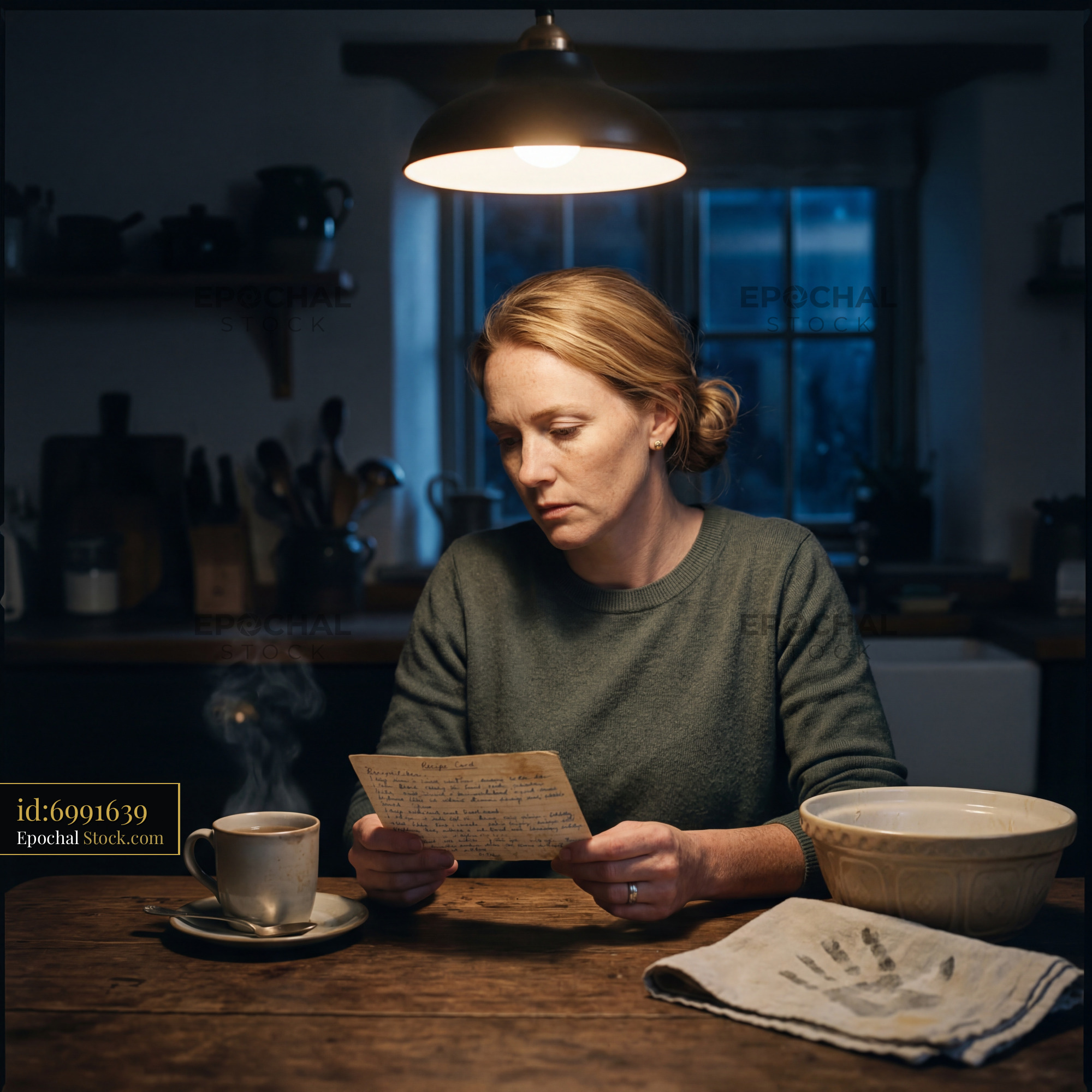 A woman sits at a wooden table in a kitchen. She holds a letter and looks thoughtful. A cup of coffee steams beside her. The room is dimly lit with a single overhead light.